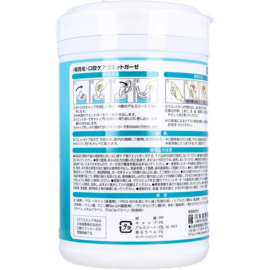 【使用上の注意】・本品は口腔内や歯の清掃等に用いる口腔ケア用ウエットガーゼです。それ以外の目的で使用しないでください。・口腔内に傷等の異常がある場合は使用しないでください。・要介護者、飲み込む力の弱い方ご自身で、または小児だけでは、使用しないでください。・乳幼児には使用しないでください。・本品は食べることは出来ませんので、ガーゼ及び薬液を飲み込まないでください。・一度使用したガーゼは絶対に再使用しないでください。・口腔内に発疹、発赤、はれ等の異常が出た場合は使用を中止し、本品を持って医師、歯科医師等にご相談ください。・もし、使用中に取り出し口からガーゼが抜け落ちた場合はキャップを外して、開封時同様、ガーゼをキャップの取り出し口に通してご使用ください。・水には溶けませんので、トイレに流さないでください。・本品の乾燥やほこり、異物の侵入を防ぐため、使用後はしっかりと取り出し口のフタを閉めて保管し、できるだけ早めに使いきってください。・取り出し口が汚れないように清潔にご使用ください。・詰替え時には、マウスピュア「口腔ケアウエットガーゼ つめ替用」をご使用ください。・詰替え時にボトル容器内が汚れている場合、洗浄し、必ずよく乾かしてから詰替えてください。・使用期限を過ぎた製品は使用しないでください。・ご使用の際は、必ず医師、歯科医師、看護師、歯科衛生士等の指導に従ってください。・直射日光、高温・多湿を避け、小児の手の届かない場所に、フタをして保管してください。