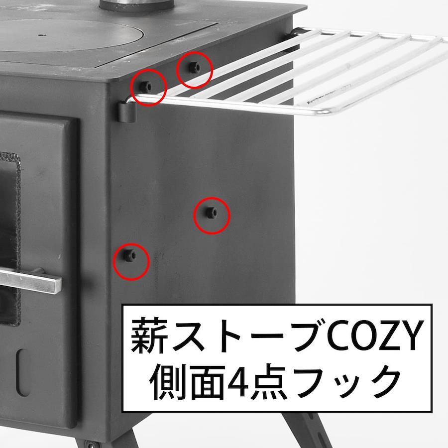 設置はストーブ側面のボルトにフックをひっかけるだけ。側面に設置できるので天板がポットに占有されず、天板が広く使えます。