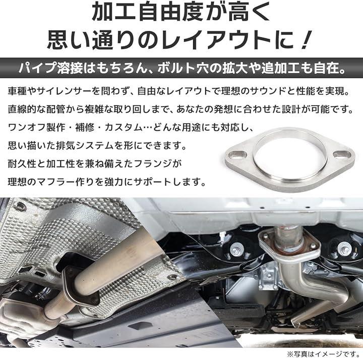 「理想のレイアウトとサウンドを実現する、高い加工自由度」パイプとの溶接はもちろん、ボルト穴の拡大や追加工も容易なため、様々な車種やサイレンサーへのフィッティングが可能です。