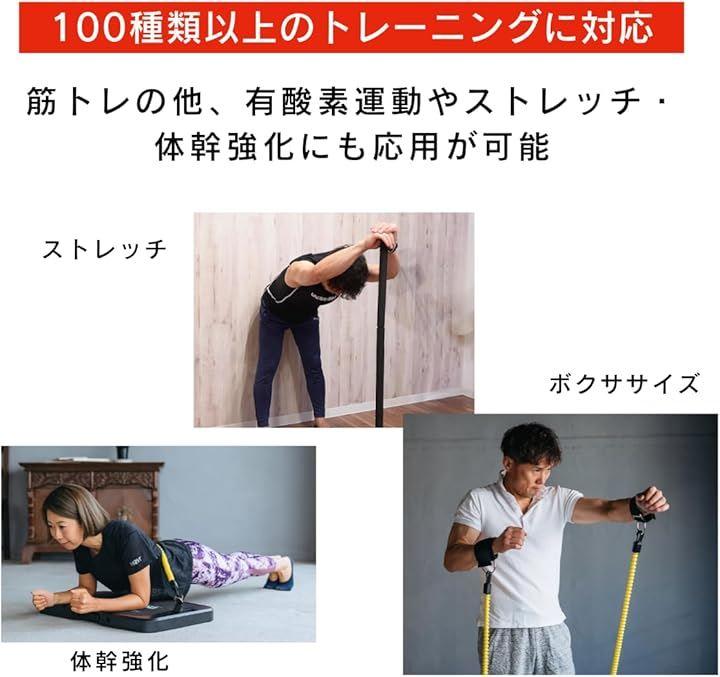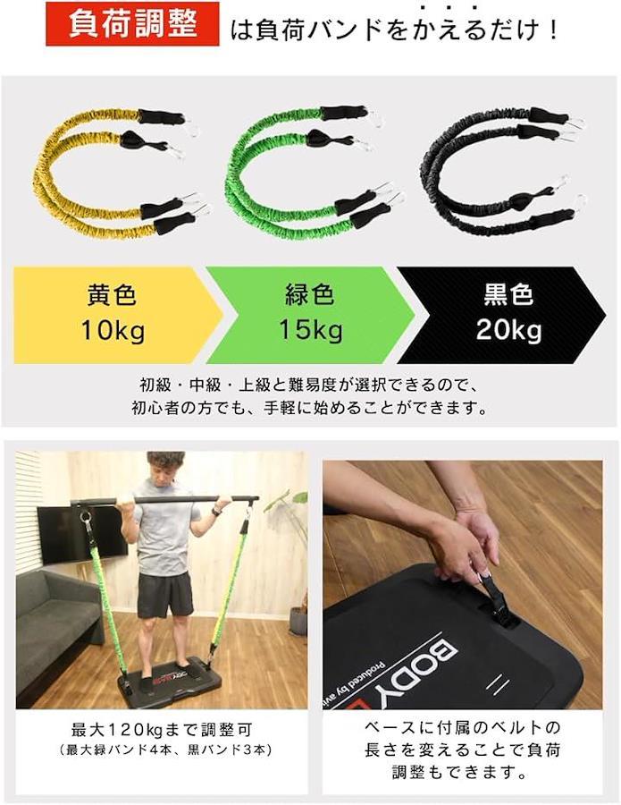 <パッケージ内容> ベース1台 、負荷バンド黄(10kg)x2本 、負荷バンド緑(15kg)x2本 、バー1本、ハンドルx2本 、ストラップx2本 、ドアアンカー1つ、バッグ1つ *負荷バンド黒色(20kg)のみ別売りです。