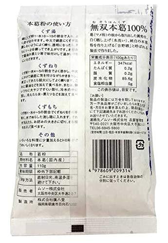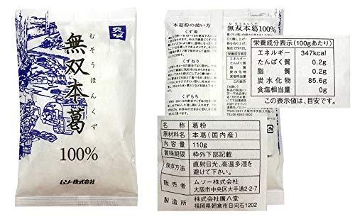 【商品詳細】 ■名称:葛粉 ■原材料名:本葛(国内産) ■内容量:110g ■賞味期間:3年 ■保存方法:直射日光、高温多湿を避けてください。 ■販売者:ムソー株式会社 ■製造所:株式会社廣八堂 【本葛粉の使い方】 ・くず湯:鍋にくず粉1・水10~15の割合で入れ、よく混ぜ合わせます。 中火で鍋底にくずが沈殿しないように練り、透明になったら、さらに 1~2分練ってでき上がりです。お好みで醤油か黒ミツ等で味付けして 温かいうちにいただきます。 ・くずねり:くず粉1・水4~5の割合でよく溶かし、中火にかけて 鍋底に気を付けながらかきまわし、煮だってきたら弱火にしてよく練ります。 これに醤油などを加えて食べるか、または、熱いうちに大サジですくい取り、 冷水の中に落とし、冷えたら氷・黒ミツなどを加えて食べます。 ・くずもち:くず粉1・水4~5の割合でくずねりを作り手早く、水でぬらした 流し箱に入れます。それが冷えたら、お好みの大きさに切り、きな粉を まぶして食べます。 ・その他:いろいろな料理に少量加えるとトロ味でておいしくなります。 【栄養成分表示】(100gあたり) ・エネルギー:347kcal ・たんぱく質:0.2g ・脂質:0.2g ・炭水化物:85.6g ・食塩相当量:0g この表示値は目安です。 *画像はイメージです。実際にお届けする商品とパッケージ等が異なる場合がございますが基本的に中味の変更はございません。 中味の変更のある商品については、商品情報を訂正して販売を行っております。