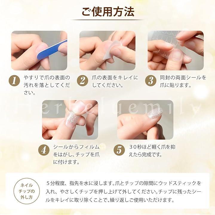 「商品仕様」専用クリアケース:7.5x7.5x1.6cm ネイルチップ10枚 付属品:両面シール、ウッドスティック、爪やすり *ネイルチップサイズの詳細は商品画像をご確認ください。