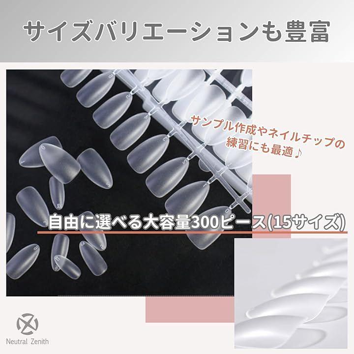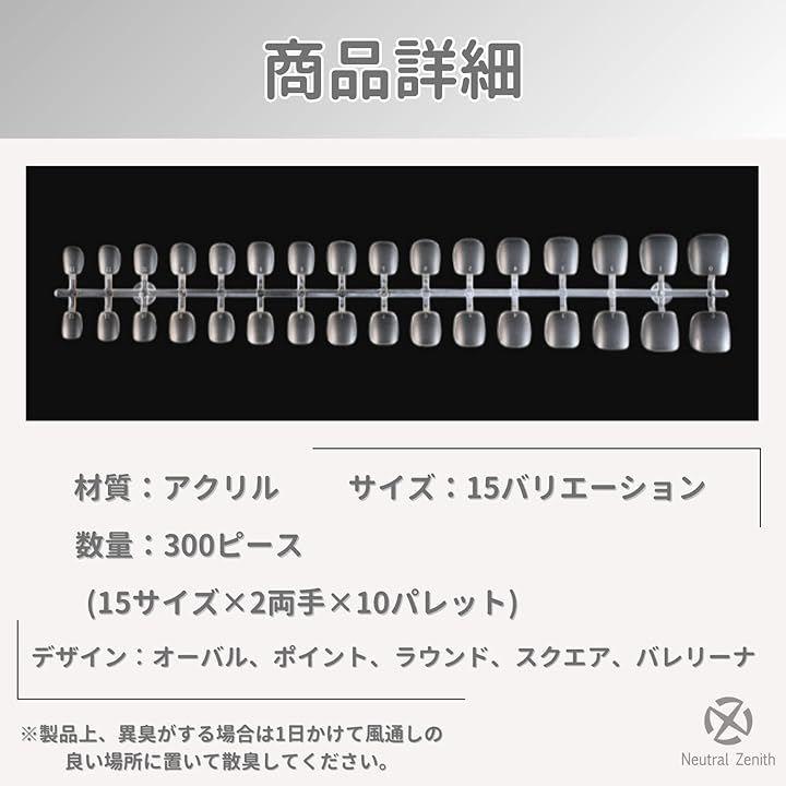 「ネイルチップ300枚入り」300ピース(15サイズx2両手x10パレット)で大容量。15サイズの多サイズバリエーションで、あらゆる指先に対応可能。