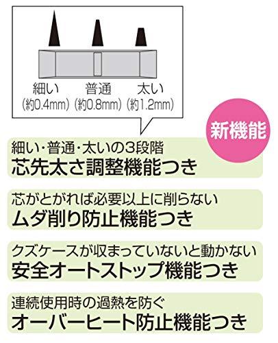 基本安全装置は標準装備。太さ調整機能も付きました。梱包サイズ:20.0×9.0×11.5cm色:ピュアホワイト/スリムコンパクトサイズで設置場所を選ばないフォルム。芯がとがれば必要以上に削らないムダ削り防止機能つき細い・普通・太いの3段階芯先太さ調整機能つきクズケースが収まっていないと動かない安全オートストップ機能つき芯がとがれば必要以上に削らないムダ削り防止機能つき連続使用時の過熱を防ぐオーバーヒート防止機能つき
