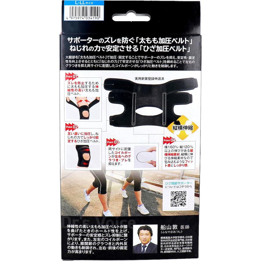 サポーターのズレを防ぐ「太もも加圧ベルト」。ねじれの力で安定させる「ひざ加圧ベルト」。大腿部を「太もも加圧ベルト」で加圧・固定することでサポーターのズレを抑え、安定性・固定性を向上させるとともに「ねじれの力」で安定させる「ひざ加圧ベルト」を締めることで左右のグラつきを抑え両サイドに配置したコイルボーンがしっかりと動きを制御します。●ズレを防止するために太もも加圧する伸縮性の高い太もも加圧ベルト。●互い違いに加圧し、ねじれの力でしっかり固定するひざ加圧ベルト。●両サイドに配置したコイルボーンが左右へのグラつき・ブレを抑えます。●横160%・縦120%以上の伸びがある縦横伸縮素材。縦横に伸びる伸縮素材なので包み込むようなフィット感としっかり感。●実用新案登録申請済。●左右兼用・男女兼用。