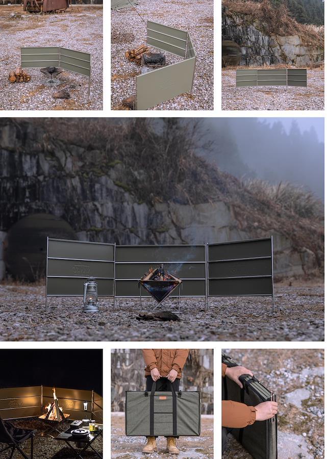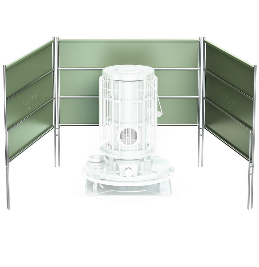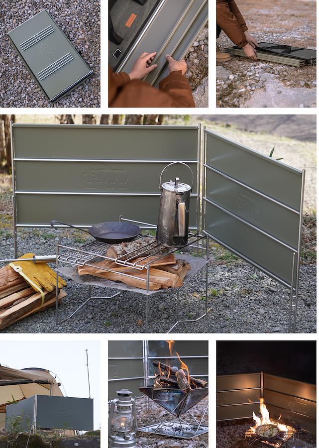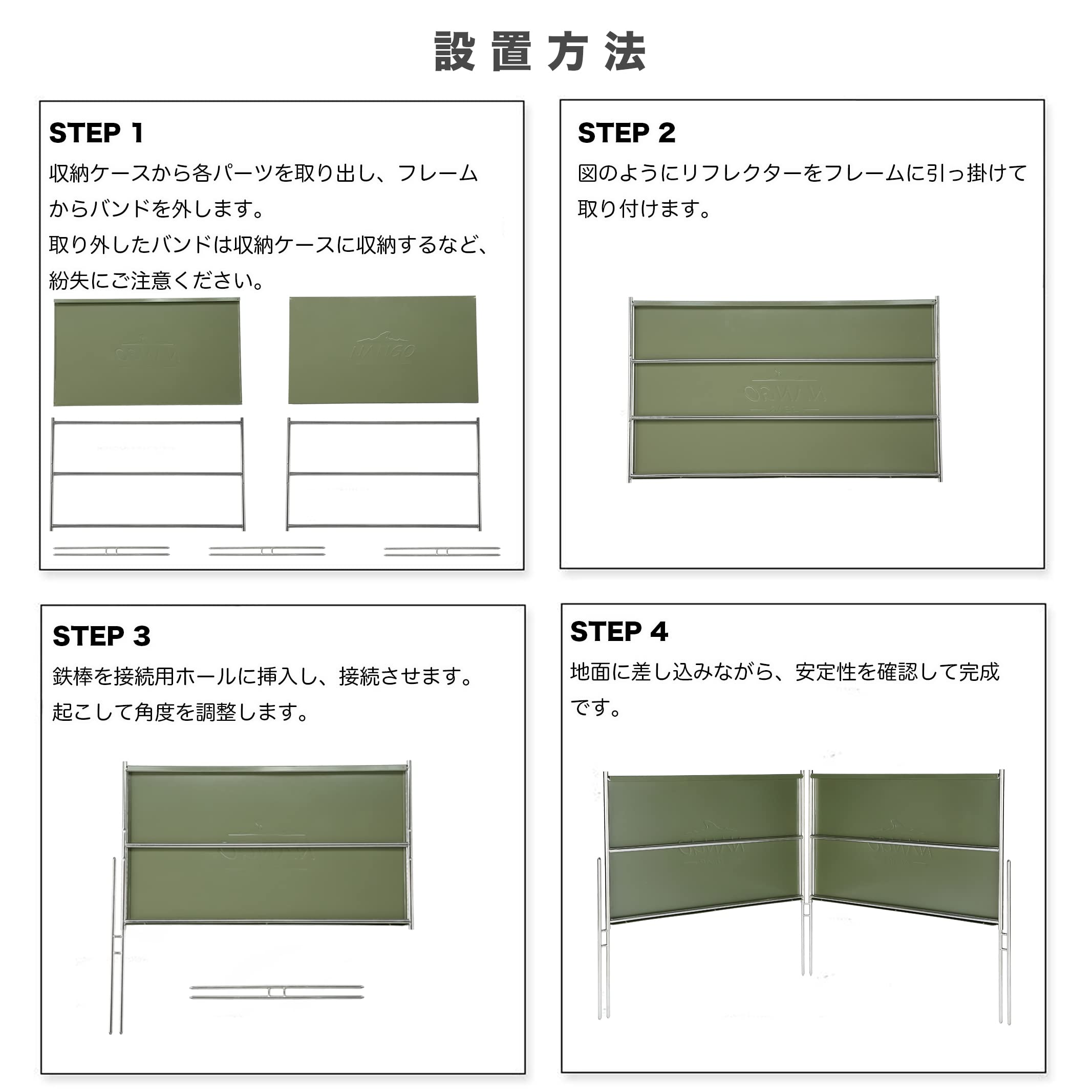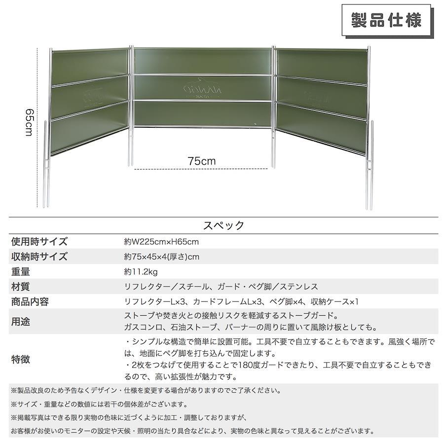 収納時サイズ:約75cm×45cm×4(厚さ)cm使用時サイズ:約W225cm×D1.5cm×H65cm重量:約11.2kg商品内容:リフレクターL×3、カードフレームL×3、鉄脚×4、収納ケース×1特徴:①シンプルな構造で簡単に設置可能ですが、キャンプサイトでの活動スペースに面して使用することで接触リスクを軽減することができます。 ②2セットをつなげて使用することで360度ガードできたり、ゴトク 挿入することでグリルスタンド になったりと、高い拡張性も魅力です。