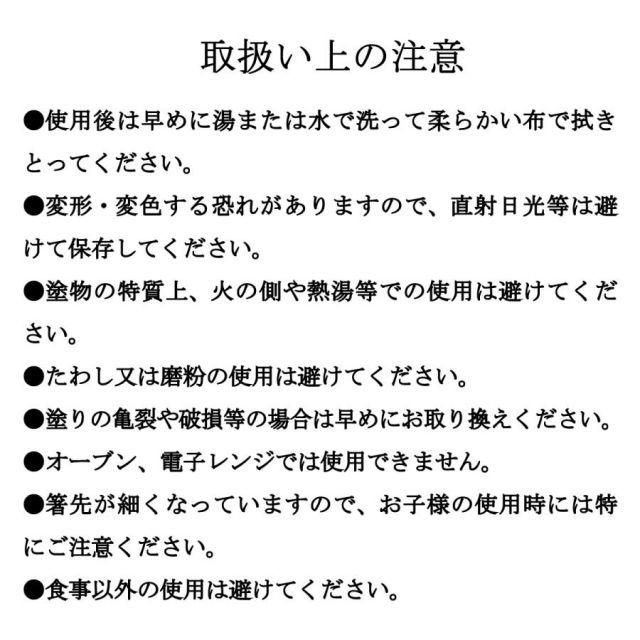 商品名:海軍箸(海上自衛隊)【海上自衛隊グッズ・自衛隊グッズ】【家庭用食器洗浄機対応】カラー:黒サイズ:長さ22.5cm素地:天然木表面塗装:アクリルウレタン塗装生産国:日本【取扱い上の注意】●使用後は早めに湯または水で洗って柔らかい布で拭きとってください。●変形・変色する恐れがありますので、直射日光等は避けて保存してください。●塗物の特質上、火の側や熱湯等での使用は避けてください。●たわし又は磨粉の使用は避けてください。●塗りの亀裂や破損等の場合は早めにお取り換えください。●オーブン、電子レンジでは使用できません。●箸先が細くなっていますので、お子様の使用時には特にご注意ください。●食事以外の使用は避けてください。