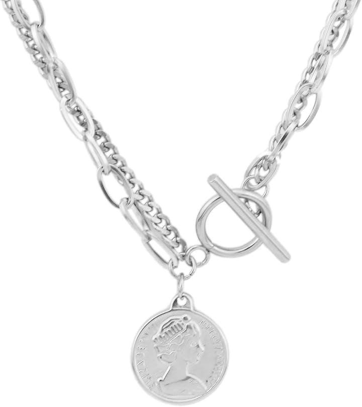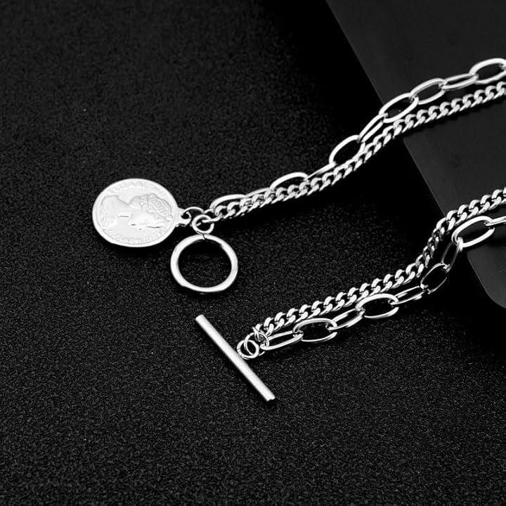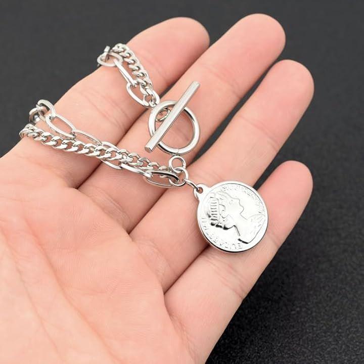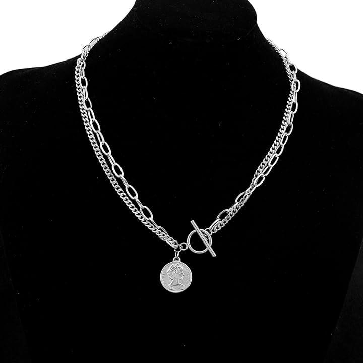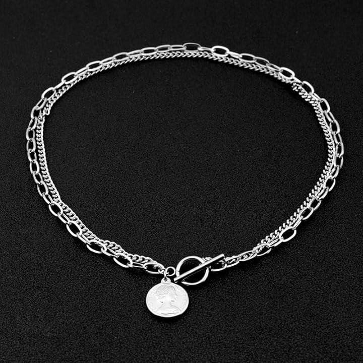 クラシカルなエリザベス女王のコインモチーフが印象的な、二連チェーンのステンレス製ネックレス。