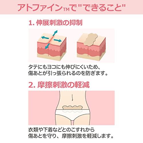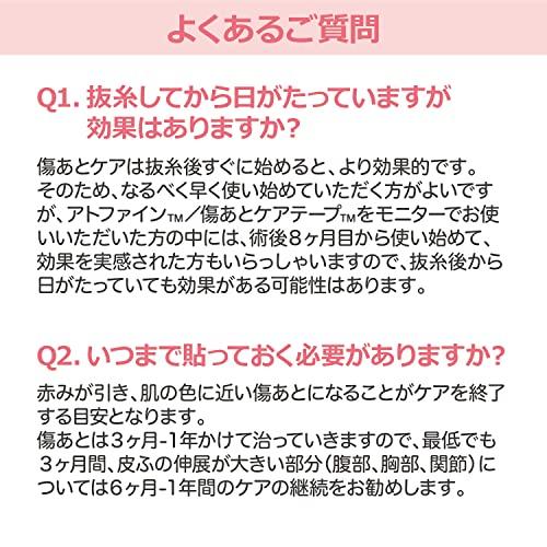 【傷あとを守る】手術の傷あとを、伸展刺激(皮ふの動きで傷あとが引っ張られること)や、 摩擦・紫外線などの外部刺激から守り、傷あとを目立ちにくくします。 【重ね貼り不要。1枚で簡単ケア】1枚のテープで傷あとを固定できるため、短冊状に切って重ね貼りする必要がありません。 【手間がかからない】交換は5~7日間に1回。毎日交換する必要がありません。 【肌にやさしい】肌にやさしい粘着剤を使用しているため、はがすときの刺激が少ないテープです。また高い透湿性により、汗をかいてもムレにくく快適です。 【はがれにくい】テープのカドをなくした、はがれにくいウェーブ形状です。
