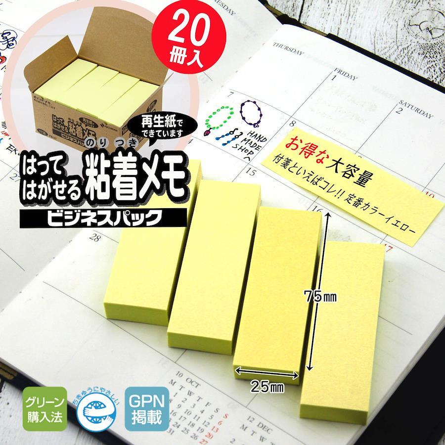 【メモサイズ】25mm×75mm【入数】100枚×20冊入【色】イエロー【基材】古紙パルプ配合率70%再生紙【粘着剤】アクリル系【免責事項】メーカーによる商品リニューアルに伴いパッケージが変更が行われた場合、新パッケージでお届け致します事ご了承願います。