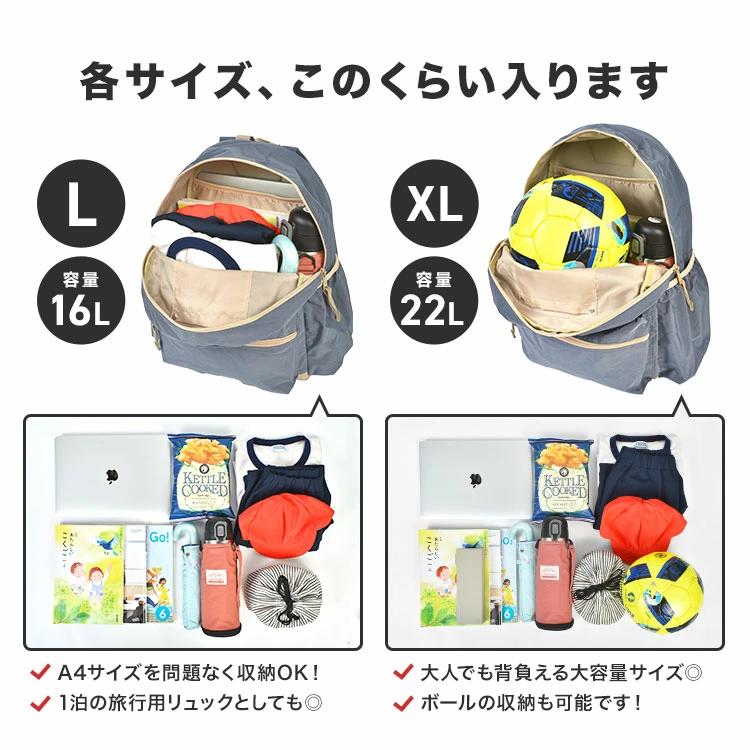 【DAYPACK GOODAY PLUS】新しく生まれ変わった定番デイパック、機能もデザインもさらにアップデート!・サイズ展開が拡充され、Lサイズ(約16L)とXLサイズ(約22L)が登場。成長やシーンに合わせて選べるようになりました。・持ち手や肩紐テープの品質も向上し、腕や肩が抜けにくく、より丈夫で安心して使える仕様に。・背面にはクッション性も加え、快適な背負い心地を実現。・内側にはウレタン素材の<仕切り布(内ポケット)>が追加、ファイルやタブレットなど、荷物整理にうれしいポイント。・ポケットやタグ位置、持ち手の形状など、細部のデザインも刷新し、より使いやすくスタイリッシュにアップデート。・小学校中学年から大人まで、普段使いはもちろん、通学、遠足、旅行、レジャーなど幅広いシーンで活躍する新しいデイパックです。
