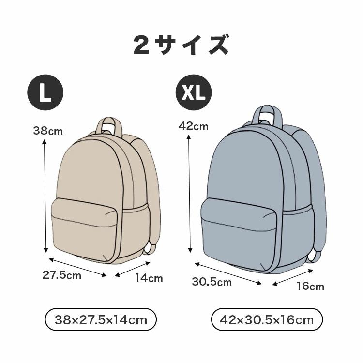 ■サイズ[L]本体:縦38×横27.5×マチ14cmフロントポケット:縦16×横24×マチ3cm内ポケット:縦12×横12cm[XL]本体:縦42×横30.5×マチ16cmフロントポケット:縦20×横26×マチ3.5cm内ポケット:縦12.5×横13cm