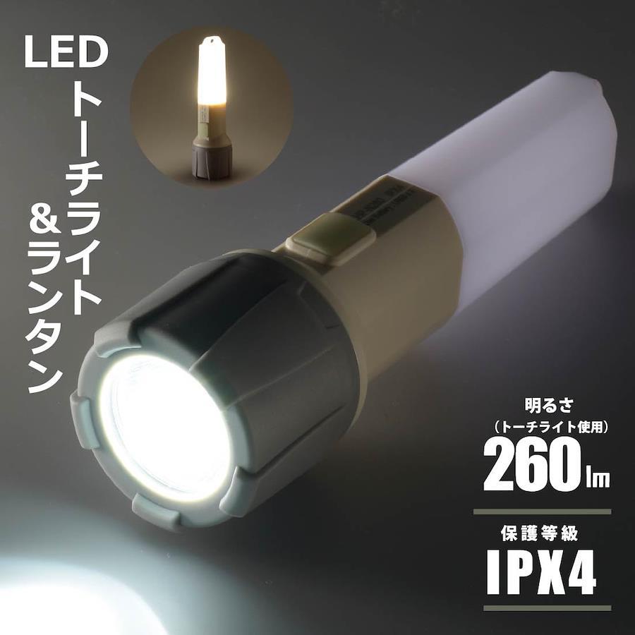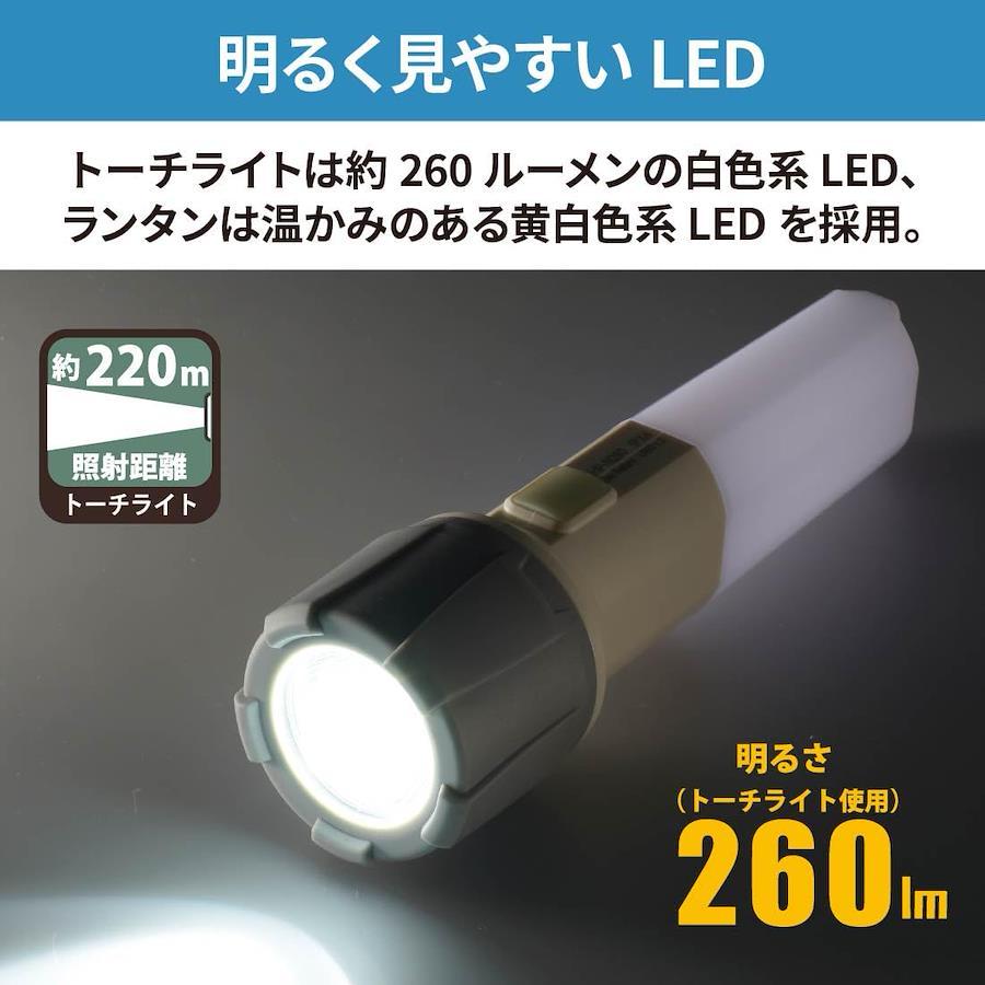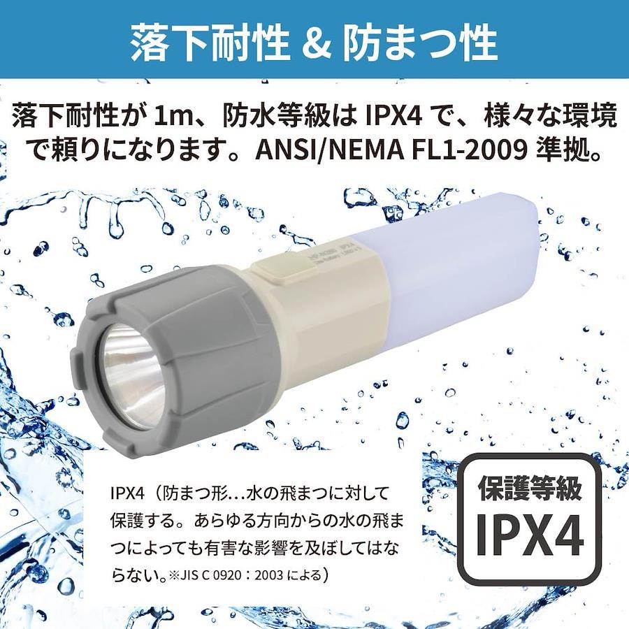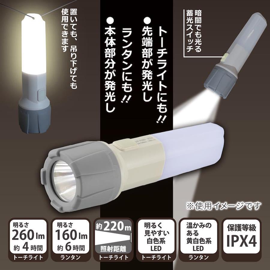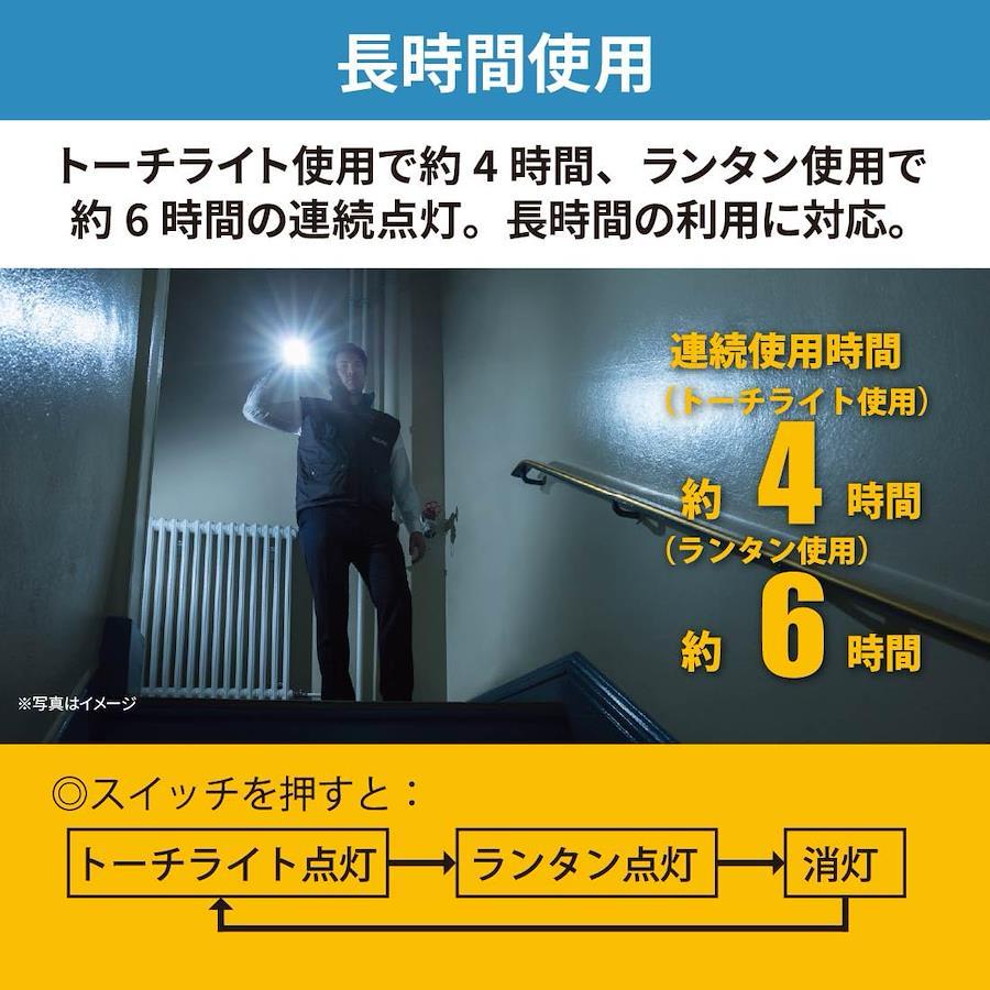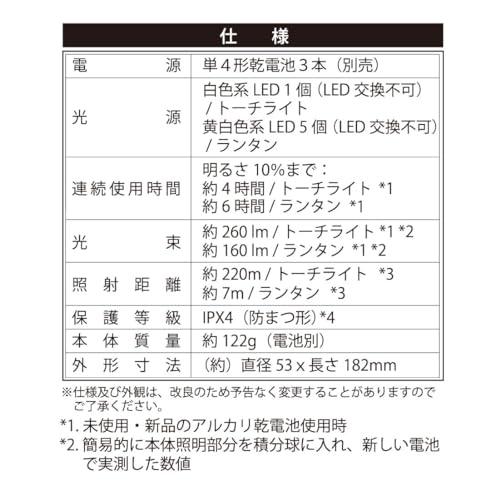 ●本体部分が発光しランタンに、また先端部が発光しトーチライトにもなります ●置いても、吊り下げても使用できます ●暗闇でも光る蓄光スイッチ ●トーチライトは明るく見やすい白色系LED、ランタンは温かみのある黄白色系LED ●明るさはトーチライト使用時で約260ルーメン、ランタン使用時で約160ルーメン ●連続使用時間はトーチライト使用時で約4時間、ランタン使用時で約6時間 ●照射距離は約220m ※トーチライト使用時 ●落下耐性は1m ●保護等級はIPX4の防まつ形 ●FL1 STANDARD(アメリカ ANSI/NEMA FL1-2009規格)準拠 ※トーチライト使用時【 特 長 】 ◆本体部分が発光しランタンに、また先端部が発光しトーチライトにもなります ◆置いても、吊り下げても使用できます ◆暗闇でも光る蓄光スイッチ ◆トーチライトは明るく見やすい白色系LED、ランタンは温かみのある黄白色系LED◆明るさはトーチライト使用時で約260ルーメン、ランタン使用時で約160ルーメン ◆連続使用時間はトーチライト使用時で約4時間、ランタン使用時で約6時間 ◆照射距離は約220m ※トーチライト使用時 ◆落下耐性は1m ◆保護等級はIPX4の防まつ形 ◆FL1 STANDARD(アメリカ ANSI/NEMA FL1-2009規格)準拠 ※トーチライト使用時【 仕 様 】 ◆電源:単4形乾電池3本(別売) ◆光源:白色系LED1個(LED交換不可)/トーチライト、黄白色系LED5個(LED交換不可)/ランタン ◆連続使用時間:明るさ10%まで…約4時間/トーチライト、約6時間/ランタン ◆光束:約260 lm(ルーメン)/トーチライト、約160 lm(ルーメン)/ランタン◆照射距離:約220m/トーチライト、約7m/ランタン ◆保護等級:IPX4(防まつ形…水の飛まつに対して保護する。あらゆる方向からの水の飛まつによっても有害な影響を及ぼしてはならない。※JIS C 0920:2003による) ◆質量:約122g(電池別) ◆外形寸法:(約)直径53×長さ182mm