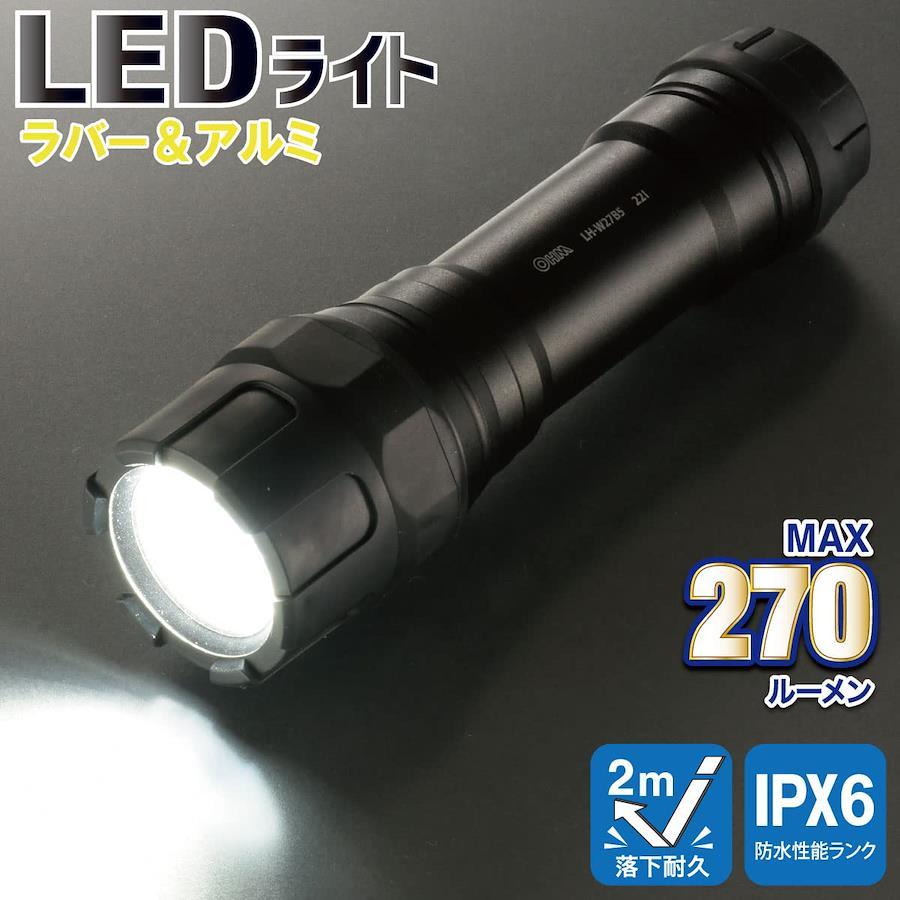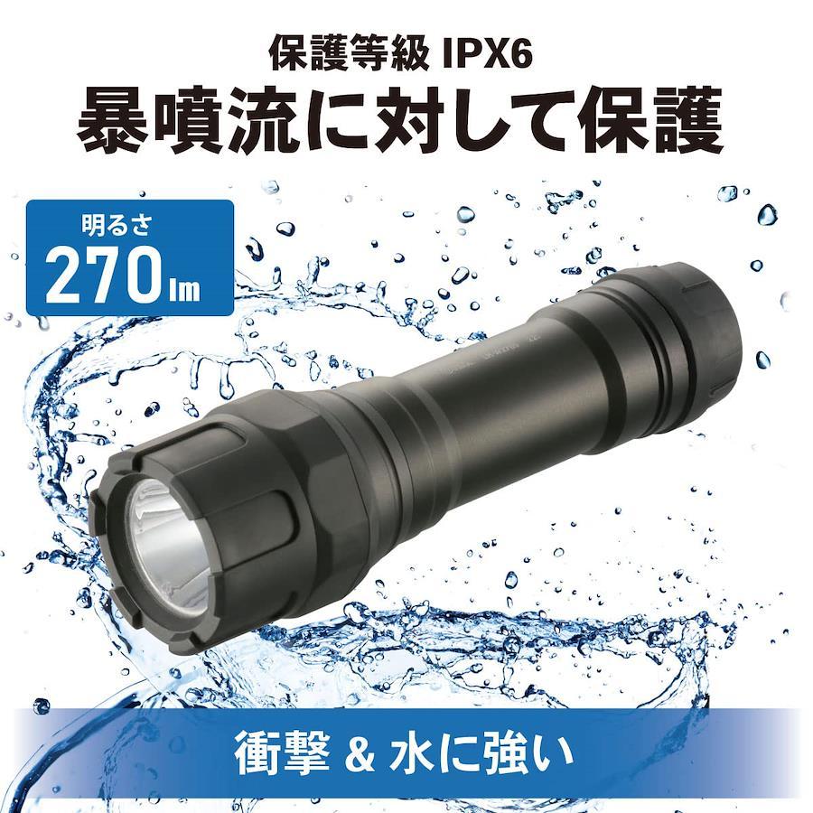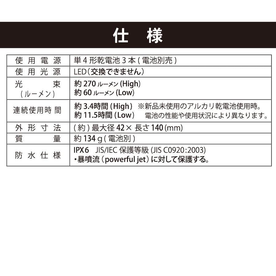 【 仕 様 】■ 電源:単4形乾電池3本(別売)■ 光源:LED(交換できません)■ 光束(ルーメン):約270 ルーメン(High)、約60ルーメン(Low)■ 連続使用時間 :約3.4時間(High)、約11.5時間(Low)※新品未使用のアルカリ乾電池使用時■ 外形寸法:(約)最大径42×長さ140(mm)■ 質量:約134g(電池別)■ 保護等級:IPX6(耐水形:暴噴流に対して保護する。あらゆる方向からのノズルによる強力なジェット噴流水によっても有害な影響を及ぼしてはならない)※JIS C 0920:2003による■ 照度:・High時:0.1m…約172000ルクス、0.5m…約23000ルクス、1m…約6000ルクス・Low時:0.1m…約20800ルクス、0.5m…約3800ルクス、1m…約1100ルクス【 特 長 】 ◆明るさ調節(High/Low)、点滅機能付き ◆落下耐久2m、防水性能ランクIPX6(耐水形)で衝撃&水に強い ◆照度は約6000ルクス(1m/High時)、光束は約270ルーメン(High時) ◆連続点灯時間は約3.4時間(High時) ◆アルミ(ボディ部分)&ラバー仕様【 仕 様 】 ◆電源:単4形乾電池3本(別売) ◆光源:LED(交換できません) ◆光束(ルーメン):約270 ルーメン(High)、約60ルーメン(Low) ◆連続使用時間 :約3.4時間(High)、約11.5時間(Low)※新品未使用のアルカリ乾電池使用時 ◆外形寸法:(約)最大径42×長さ140(mm)◆質量:約134g(電池別) ◆保護等級:IPX6(耐水形:暴噴流に対して保護する。あらゆる方向からのノズルによる強力なジェット噴流水によっても有害な影響を及ぼしてはならない)※JIS C 0920:2003による ◆照度: ・High時:0.1m…約172000ルクス、0.5m…約23000ルクス、1m…約6000ルクス ・Low時:0.1m…約20800ルクス、0.5m…約3800ルクス、1m…約1100ルクス