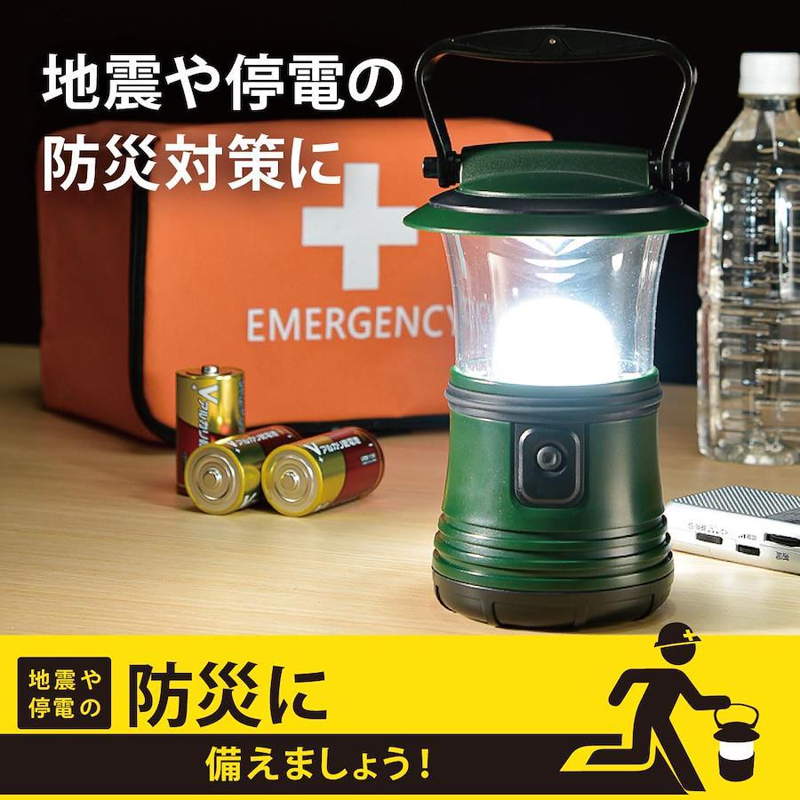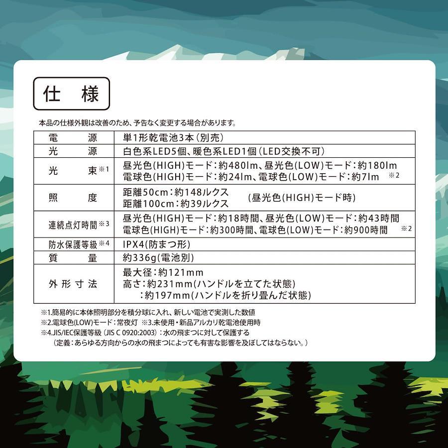 ●昼光色、電球色に調色できます ●昼光色、電球色それぞれ2段階(HIGH/LOW)に調光できます ●明るさ約480ルーメン ※昼光色(HIGH)モード時 ●防水保護等級はIPX4の防まつ形 ●乾電池式(単1形乾電池×3本:別売) ●地震や停電の防災対策に【 特 長 】 ◆昼光色、電球色に調色できます ◆昼光色、電球色それぞれ2段階(HIGH/LOW)に調光できます ◆明るさ約480ルーメン ※昼光色(HIGH)モード時 ◆防水保護等級はIPX4の防まつ形 ◆乾電池式(単1形乾電池×3本:別売) ◆地震や停電の防災対策に【 仕 様 】 ◆電源:単1形乾電池×3本(別売) ◆光源:白色系LED5個、暖色系LED1個(LED交換不可) ◆光束:・ 昼光色(HIGH)モード…約480 lm、昼光色(LOW)モード…約180 lm・ 電球色(HIGH)モード…約24 lm、電球色(LOW)モード…約7 lm◆照度:距離50cm…約148ルクス、距離100cm…約39ルクス(昼光色HIGHモード時) ◆連続点灯時間:・ 昼光色(HIGH)モード…約18時間、昼光色(LOW)モード…約43時間・ 電球色(HIGH)モード…約300時間、電球色(LOW)モード…約900時間◆防水保護等級:IPX4(防まつ形…あらゆる方向からの水の飛まつによっても有害な影響を及ぼしてはならない ※JIS C 0920:2003による ◆質量:約336g(電池別) ◆外形寸法:最大径…約121mm、高さ…約231mm(ハンドルを立てた状態)、約197mm(ハンドルを折り畳んだ状態)