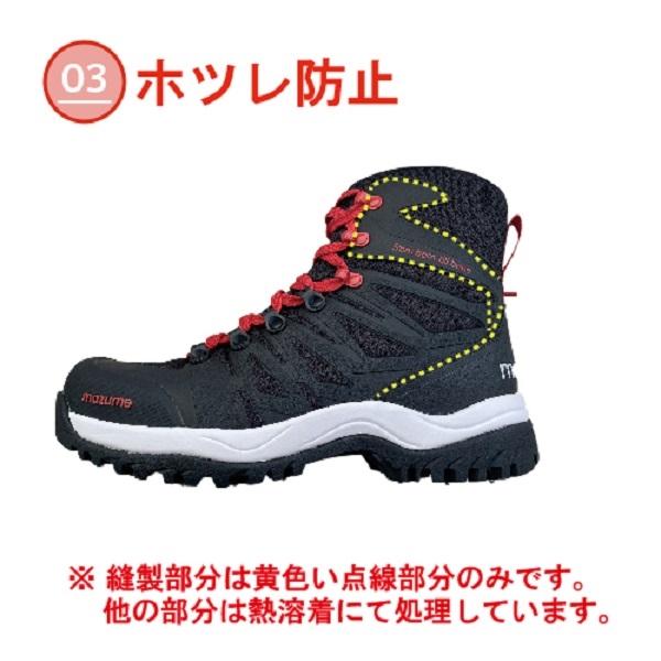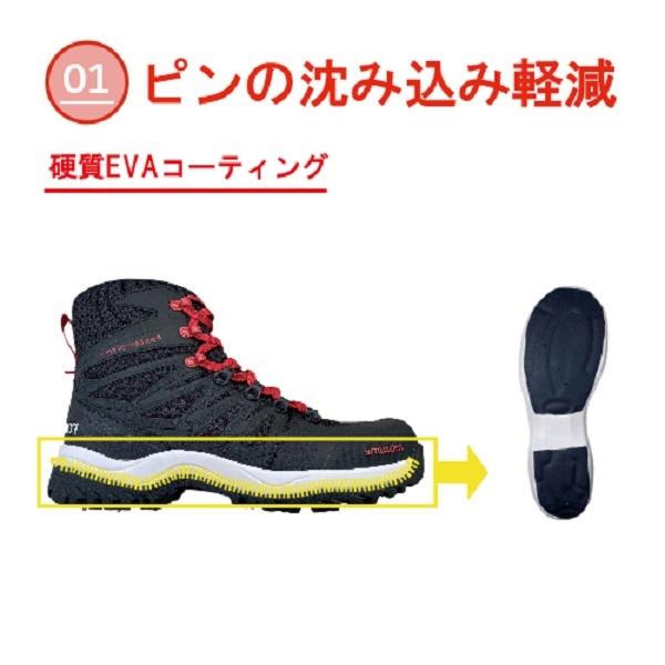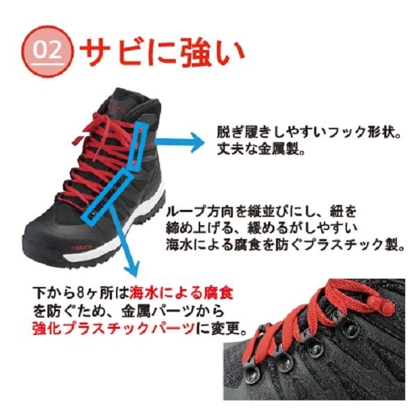 タングステンピンの沈みこみを防ぐために、ピンの土台部分の大きさを足つきに影響が出ない程度に大きくしました。また、ミッドソールのピンの土台部分が設置する面にコーティングを施しピンが沈みこみにくくなりました。全14か所あるシューレースホール。その中の、下から4段目までの8個を金属パーツからプラパーツに変更。錆びでシューレースが切れることを軽減。上3段の6個はこれまで通り強度を重要視した金属パーツを採用。これまではプラパーツに強度の面で不安があり、採用していませんでした。技術の進化が、強度が高いプラパーツの使用を可能にしました。 サイズ(単位:cm)S:24~25 サイズ(単位:cm)M:25~26 サイズ(単位:cm)L:26~27 サイズ(単位:cm)LL:27~28 サイズ(単位:cm)3L:28~29 サイズ(単位:cm)4L:29~30 ※実物と色が違って見える場合があります。あらかじめご了承下さい。