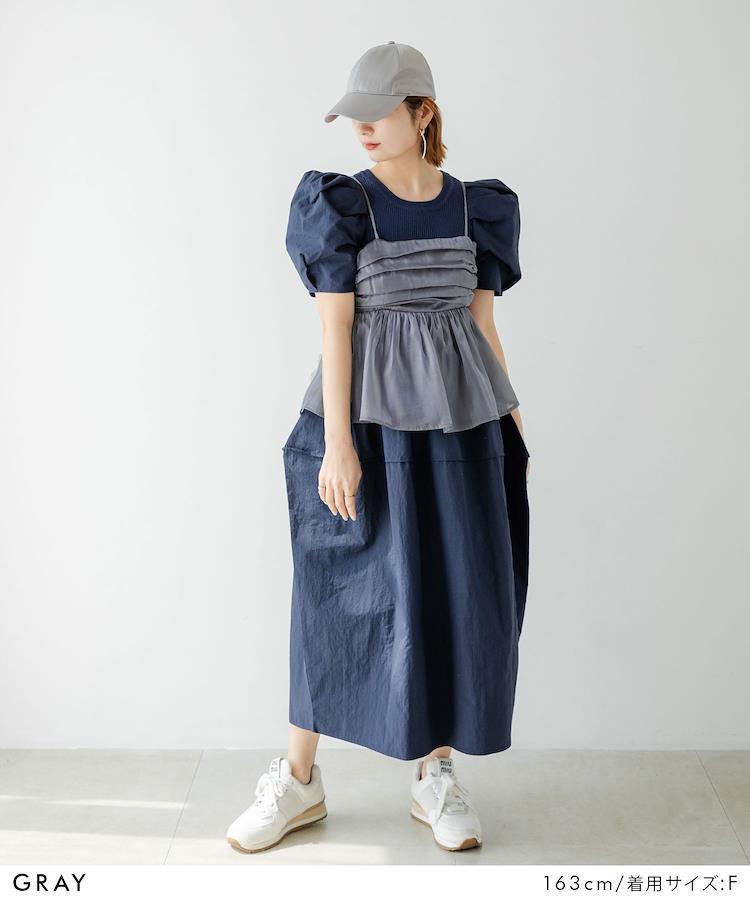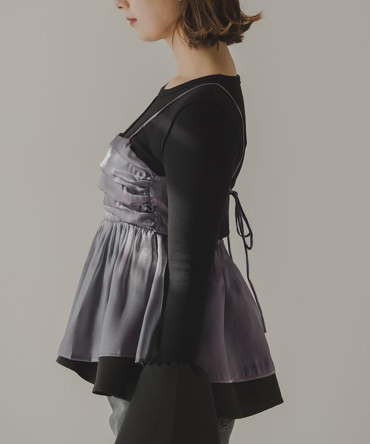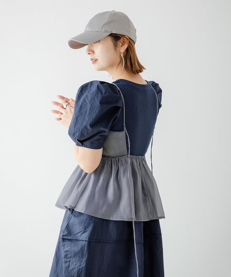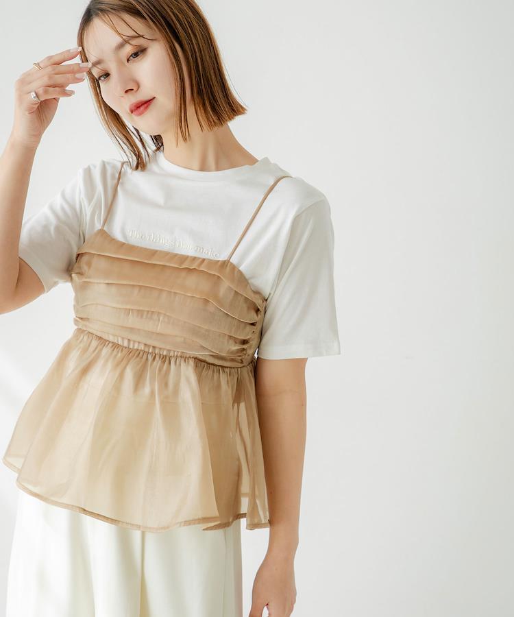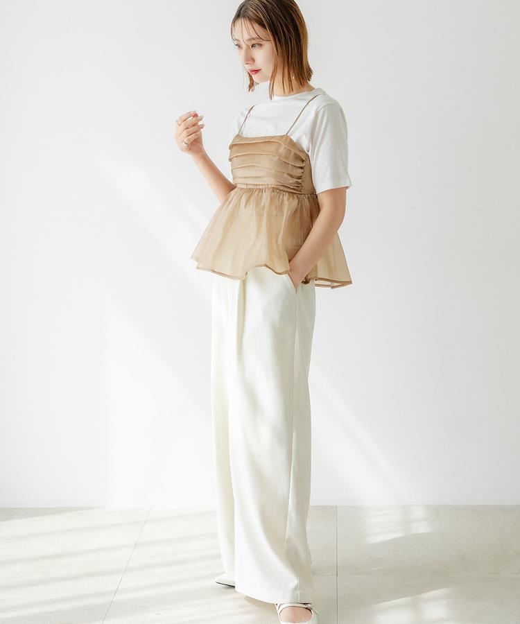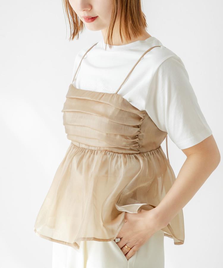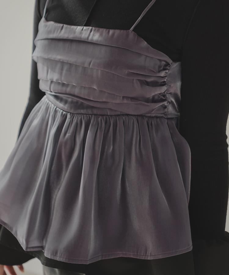 艶やかなオーガンジー素材が魅力的なペプラムキャミソール【ディティール】柔らかさとハリ感を兼ね備えたオーガンジーサテン素材で仕立てたキャミソール。バストのタックギャザーで立体感をメイク。胸下から裾にかけて美しく広がるフレアシルエットはそれだけで可愛いらしさ満点。華奢なストラップも魅力です。紐は結び方で長さを調整できるので、コーディネートに合わせて高さをアレンジ可能◎バッククロスにもできます。ペプラム切替位置で目線が上にあがるので、スタイルアップ効果も期待できます。【スタイリング】カットソーやシャツの上に重ねるだけで一気にコーディネートをアップデート。インナーやパンツ次第でカジュアルにもきれいめにも着られる万能プラスワンアイテムです。**********************透け感:ややあり裏地:なし伸縮性:なし光沢感:あり生地の厚さ:普通**********************《生産国》中国
