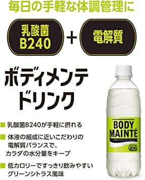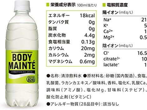 内容量:500ml×24本原産国:日本カラダを守る乳酸菌B240により体調維持をサポート水分・電解質によりカラダの適切な水分量をサポート低カロリーでスッキリ飲みやすいグリーンシトラス風味栄養成分 100ml当たり:エネルギー 18kcal、タンパク質 0g、脂質 0g、炭水化物 4.4g、食塩相当量 0.13g、カリウム 20mg、カルシウム 2mg、マグネシウム 0.6mgアレルギー物質(28品目中):該当なし【重要】メーカーによる商品リニューアルに伴いパッケージ(内容量も含む)変更が行われた場合、新パッケージでお届け致します事ご了承願います。