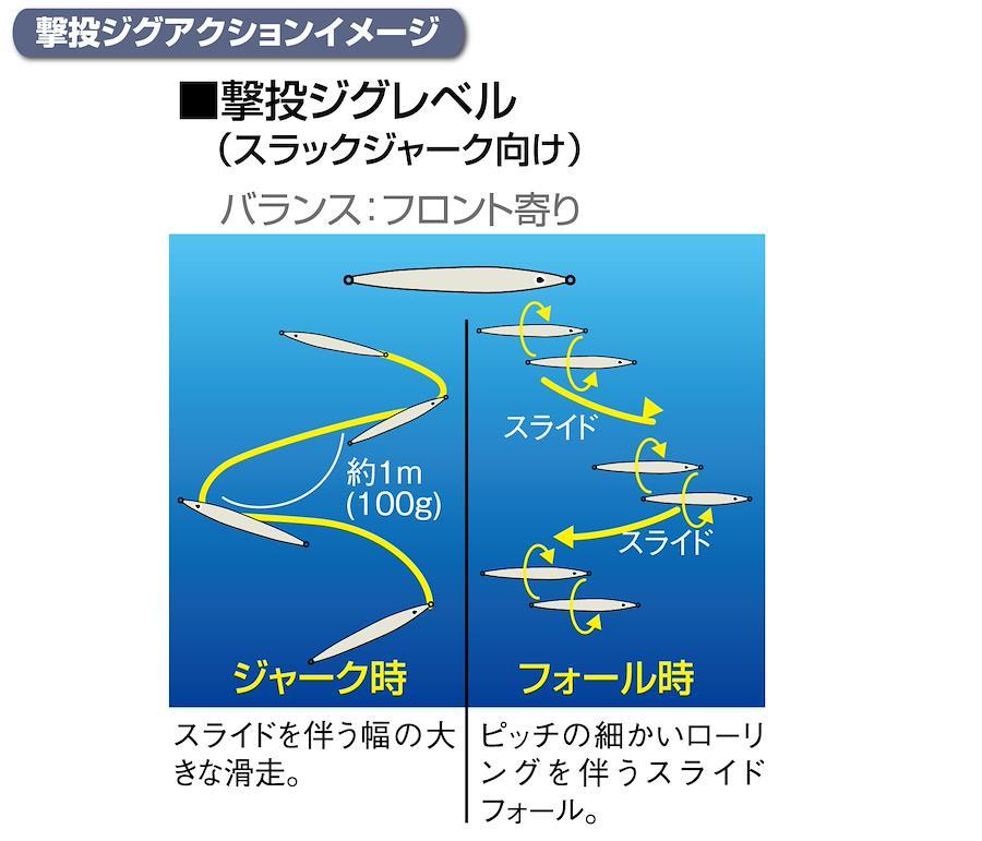 レベルの目指したものはタメのきく水平フォール。スローなジグ操作で真価を発揮します。オフショアではすでに、スローコンセプトの優秀なジグがいくつか発表され、今まで口を使わなかった魚達を次々に引き出す成果を見せています。スローな操作に使える、タメのきくジグがショア用にもあれば・・・。しかしながら、撃投は「落とすジグ」ではなく「投げるジグ」ハードなフィールドでの酷使に耐えなければなりません。求められる機能は船からのそれとは異なります。まずタフでなければなりません。しかも飛ばなくてはなりません。できれば、軽快でなくてはなりません。着底感も、操作感も、魚のまとわりつきも・・・。全てが鈍くなるのがショアの釣り。だからこそ諦めずに、繊細な操作を極めたいと思う。タメのきく、フロントウェイトジグ「レベル」こいつなら、またひとつ新しい世界が拓ける事は、間違いありません。