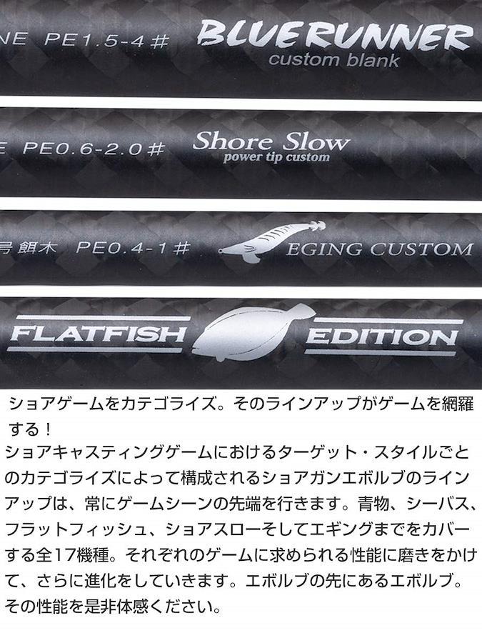 ショアゲームにむけた新たなるベンチマークがここにある。ショアキャスティングゲームをサポートする信頼のショアガンがエボルブへと進化しました。バットセクションに採用した高弾性マテリアル、それぞれのゲームスタイルに最適化したパーツを搭載することで、キャスタビリティの向上と各ターゲットに向けた充実のスペックを実現しました。ヒラメ、ショア青物、ショアスローなどゲームスタイルごとに最適化したスペシャライズドモデルで構築したシリーズ群が強力にあなたのゲームをサポートします。