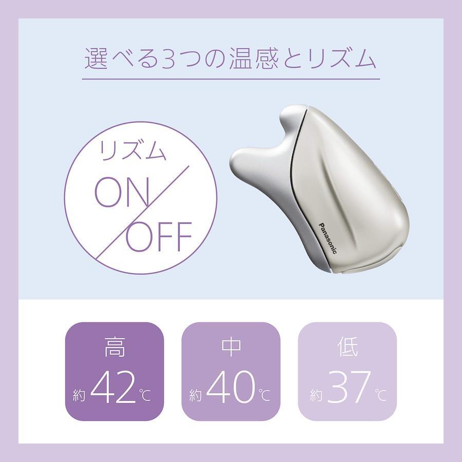肌に心地よい流れ。温感かっさで、ドレナージュ※1エステ。(※1 ドレナージュとはエステの手技の名称です。)/密着度高く設計された4つのフィットカーブで実現されるドレナージュ※1手技。/約42 ℃の高温設定新搭載。お好みで選べるリズムと3段階の温度設定。/お手持ちの化粧水やボディローションなどと一緒に使える。/生産国:中国/本体寸法:高さ6.4×幅10.2×奥行3.2 cm 質量:約105 g(ACアダプター 約120g)