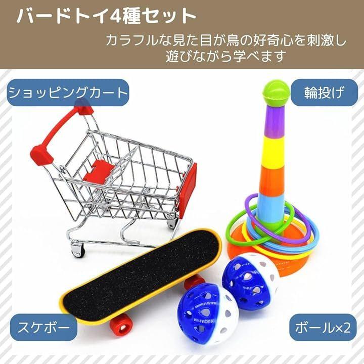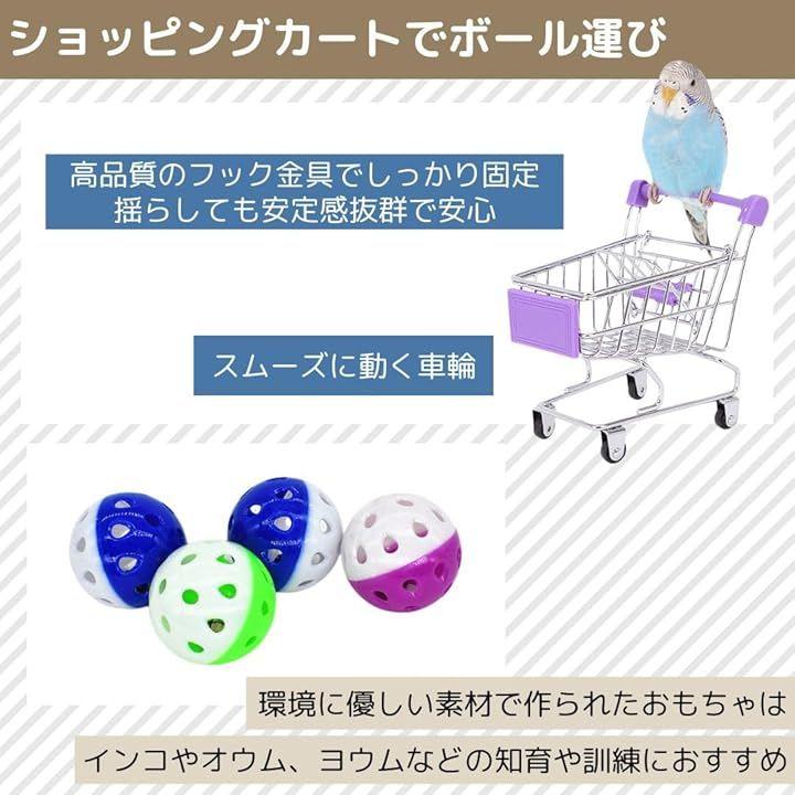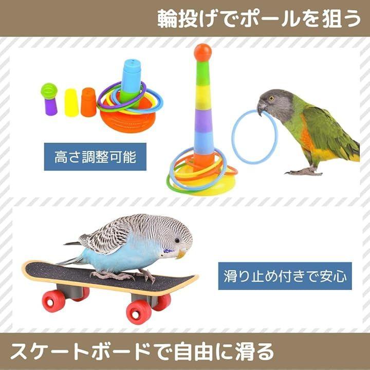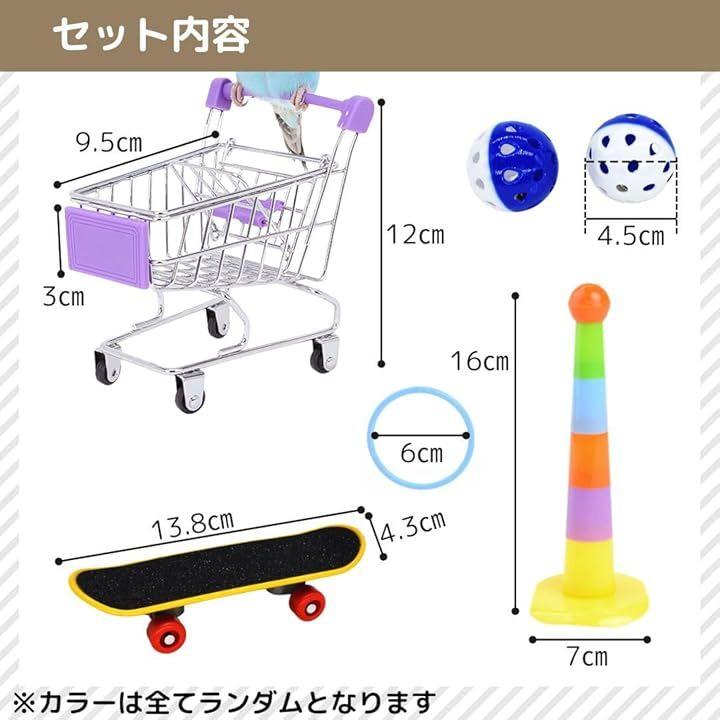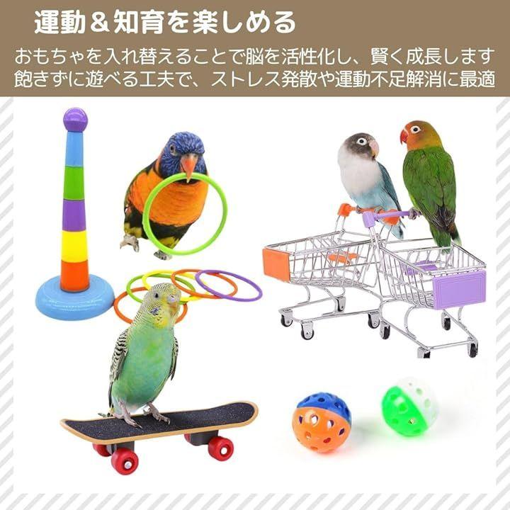 「本格的な動きで小鳥も夢中」ショッピングカートでボールを運び、スケートボードで自由に滑り、輪投げでポールを狙う。それぞれのアイテムが動きのある遊びを提供します。