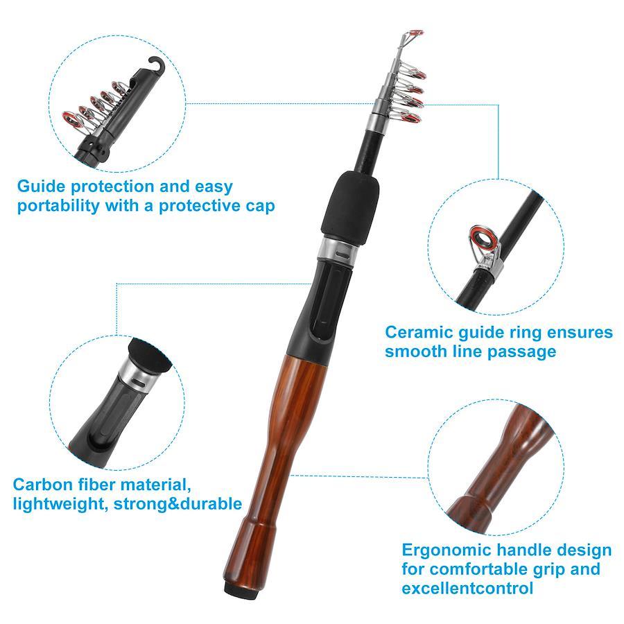 利点強化セラミックスムーズガイドリング:高感度とスムーズなライン動作のための大きなサイズ。エルゴノミックデザイン:快適なグリップと優れたコントロールのためのエルゴノミックなハンドルデザイン。信頼性のある金属爆発防止リング:圧力下での竿の割れを防ぎます。効果的な黒ポール保護キャップ:収納や輸送時にガイドリングを保護します。木目調の快適なグリップ:スタイリッシュな外観と快適な握り心地でより楽しいグリップを提供します。持ち運びが簡単:縮めるとわずか38センチになり、持ち運びが容易です。