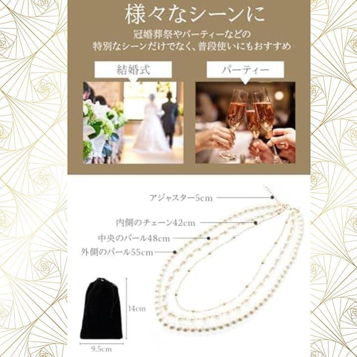 このパールネックレスは、冠婚葬祭や結婚式、パーティーなどの特別なシーンだけでなく、普段使いにもおすすめです。パールの大きさや大ぶりなデザインは、どんなコーディネートにも華やかさをプラスしてくれます。