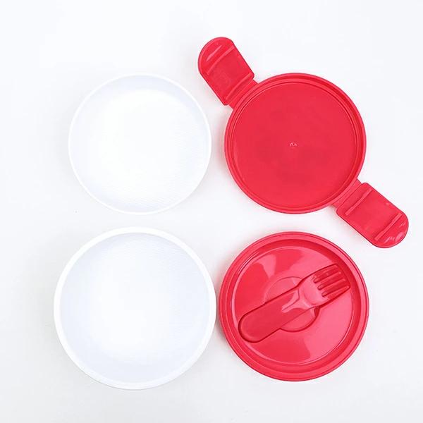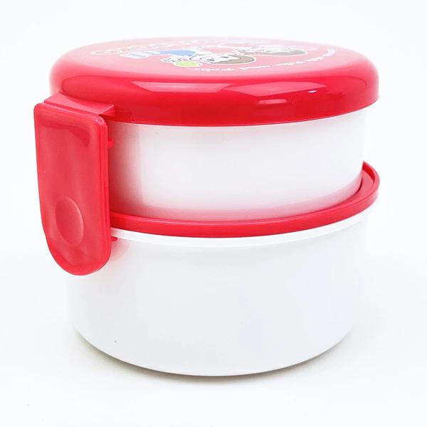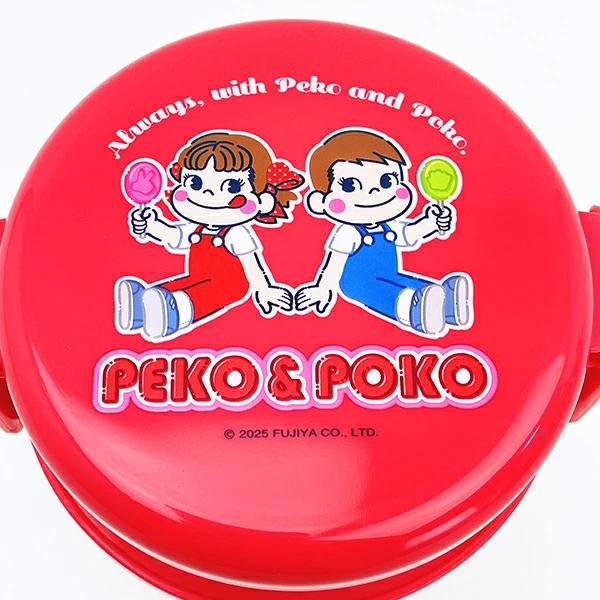 ペコの丸型ランチボックスです。小さな丸型のシンプル2段お弁当箱なのでコンビニの丸型おにぎり1個が袋のまますっぽり入ります♪上段下段とも、ごはんがつきにくい「くっつかない加工」。内蓋収納フォーク(プラスチック製)付きが嬉しいポイント!食べ終われば1段にコンパクトに収納できちゃうので、持ち帰りも楽々♪なかよしなペコ&ポコのデザインが可愛すぎます☆彡フタ・シールフタ・フォークを外して電子レンジ使用可◎【容量:上段230ml/下段270ml】
