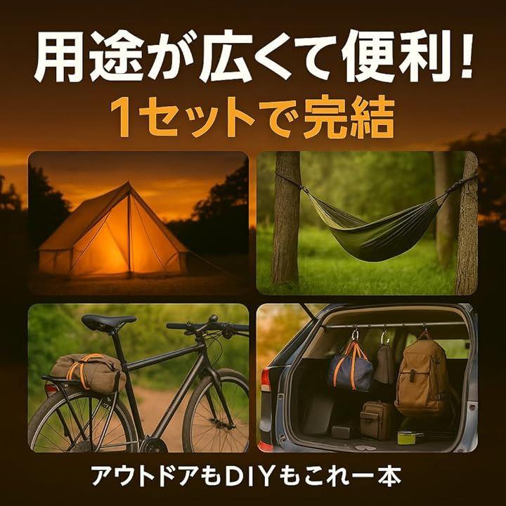 「マルチユースで大活躍」テント固定からランタン吊り下げ、荷物固定、ハンモック設営まで1セットであらゆるアウトドアシーンを網羅。