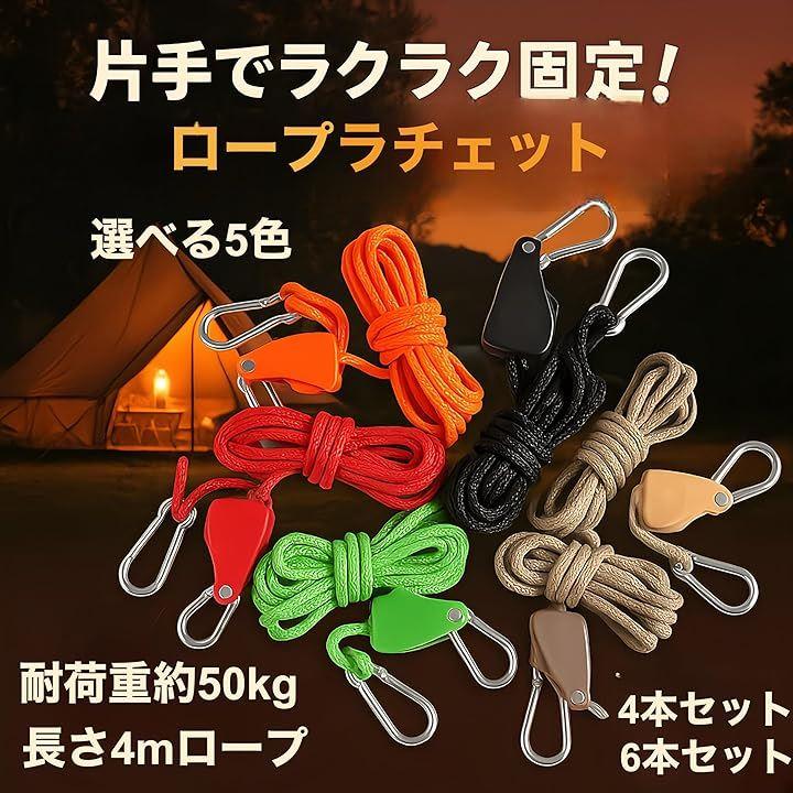 タープの固定からランタンの吊り下げ、荷物のまとめまであらゆるシーンで活躍する4本セットのロープラチェットは工具いらずでロープを引くだけの簡単操作だから力の弱い方や初心者でも安心して使え、耐荷重50kgを誇る4mm径の高強度反射ロープはUVや水濡れにも強くコンパクトに収納できるから持ち運びもラクラク、5色のカラーバリエーションから選べばキャンプサイトのコーディネートも楽しくなり自宅やDIYシーンにも応用可能、設営時間を短縮することで家族や仲間との大切な時間が増える、アウトドアに欠かせないギアです。