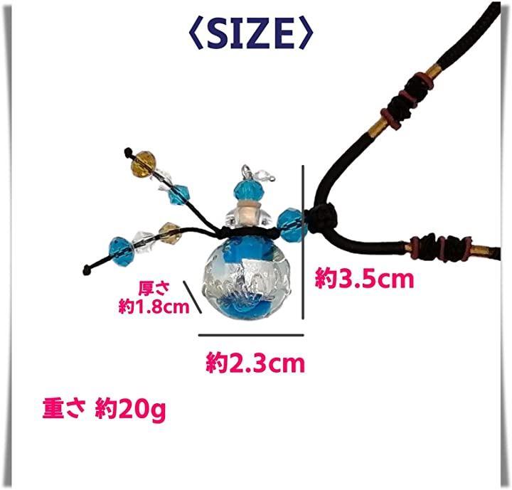 見た目にもかわいいから、プレゼントにも*。 サイズ 本体 幅約2.3cm 高さ約3.5cm 厚さ約1.8cm 紐の長さ 約55~71cm 重さ 約20g *コルクの蓋部分は通常の使用では問題ありませんが、激しい動きなどで蓋が緩んで 外れることもありますので、アロマオイル等ペンダントヘッドの瓶に入れる際は、布や綿などに染み込ませてから ご使用する事をオススメします。