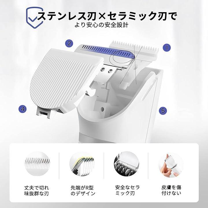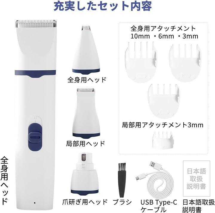 「セット内容」セット内容:バリカン本体x1、刃ヘッドx4、アタッチメントx4、USBケーブルx1、ブラシx1、日本語取扱書x1。