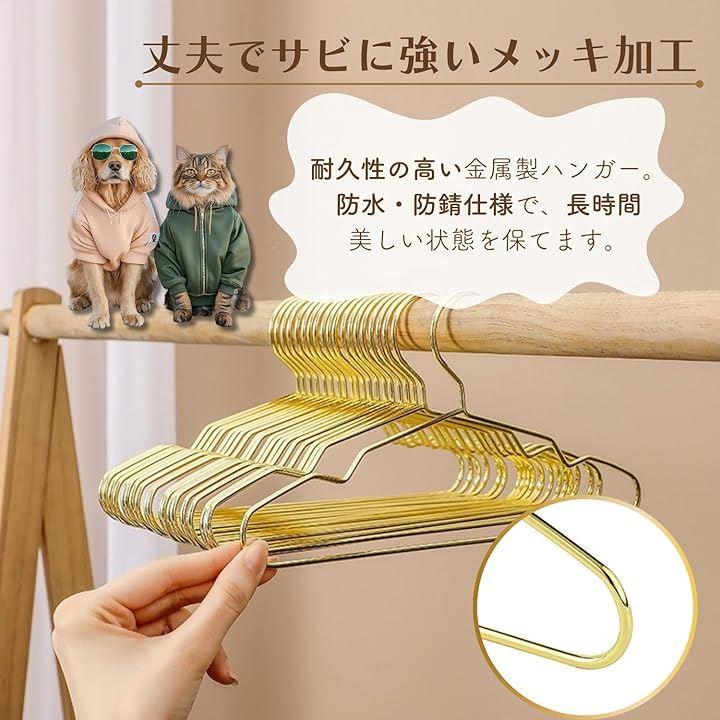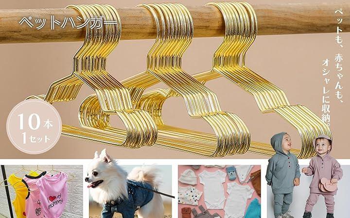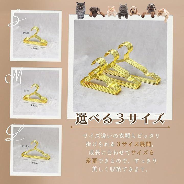 「セット内容」ペット用ハンガー10本セット 「サイズ」S:幅12cm 高さ9.5cm / M:幅15cm 高さ11cm / L:幅20cm 高さ12.5cm 「素材」スチールメタル(エコロジーゴールドコーティング) 「用途」ペット服 赤ちゃん服 人形服 下着 マスク 小物収納
