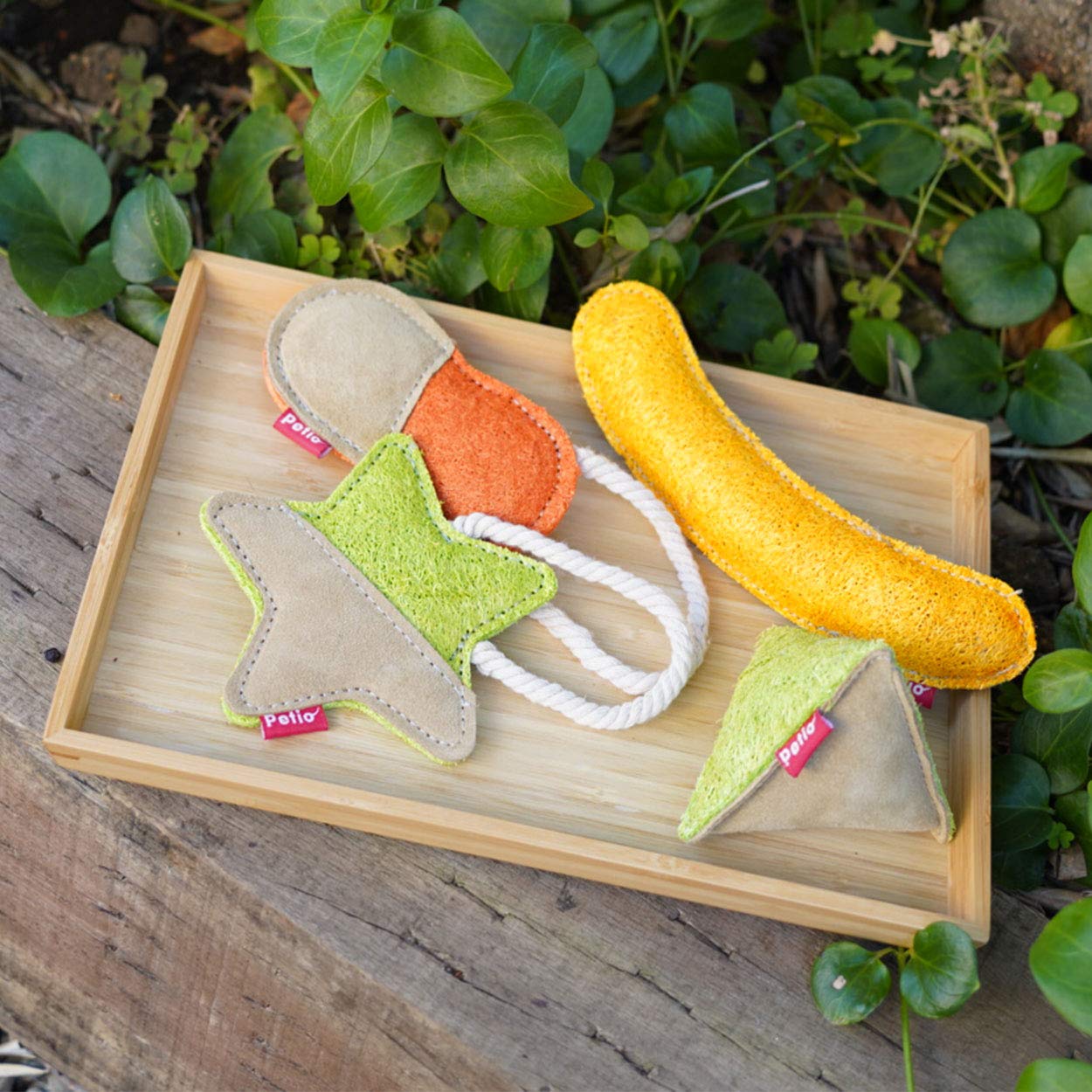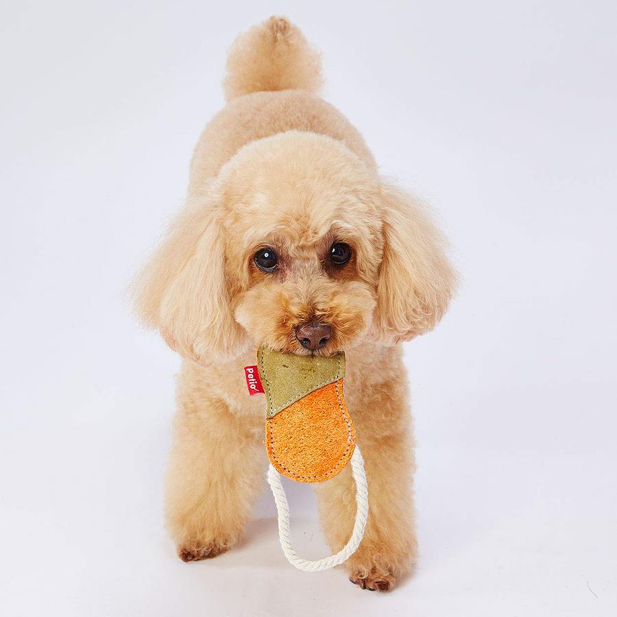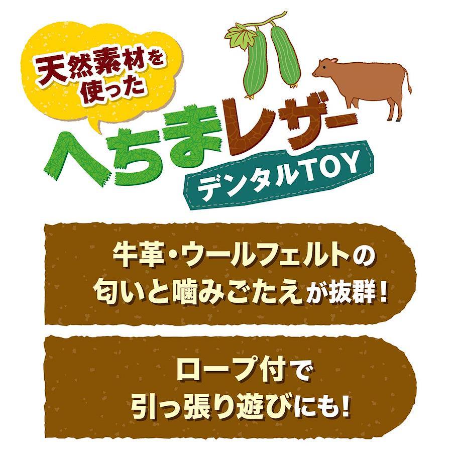 天然素材であるへちまと牛革を使用したデンタル玩具。レザーとウールフェルトの香りで思わずカミカミ!へちまの繊維に歯が食い込み歯をブラッシング!!