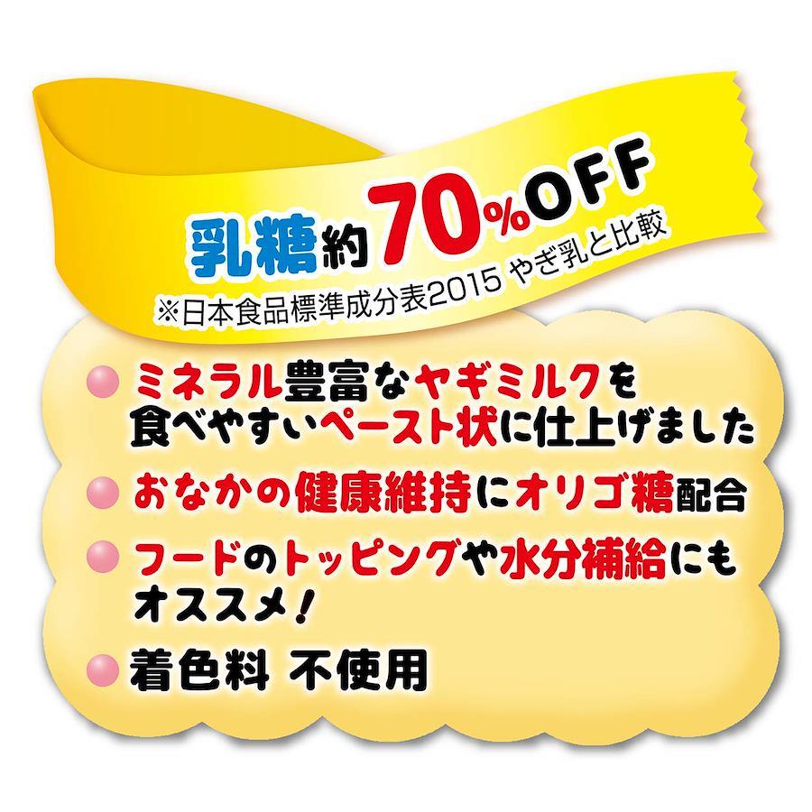 ミネラル豊富なヤギミルクを食べやすいペースト状に仕上げました。おなかの健康維持にオリゴ糖配合。フードのトッピングや水分補給にもオススメ!着色料不使用。