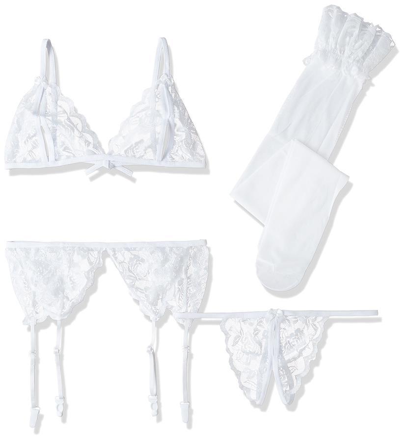 メイン素材: polycotton 素材構成: 100% 素材構成比情報なし(合成繊維(polycotton)) セクシーなランジェリー 4点セット サイズ:フリーサイズ(S~L) カラー:白 Tバックショーツはオープンクロッチ仕様です! ブラとTバックショーツがオープンクロッチ仕様の為大変セクシーなランジェリーです。 デリケートな素材(レース仕様の為薄い素材となります)の為取り扱いに注意! お洗濯は、手洗いがお勧めです 。