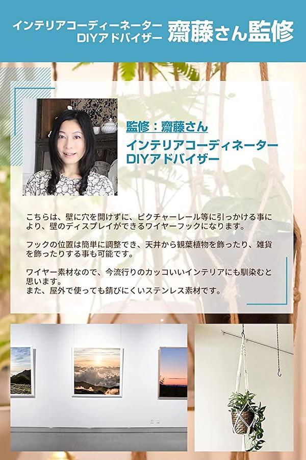 「使用方法」使用方法は非常にシンプルで、ワイヤーの上部レールフックなどにを引っかけ、ピクチャーフックを額縁の裏に引っ掛けるだけです。