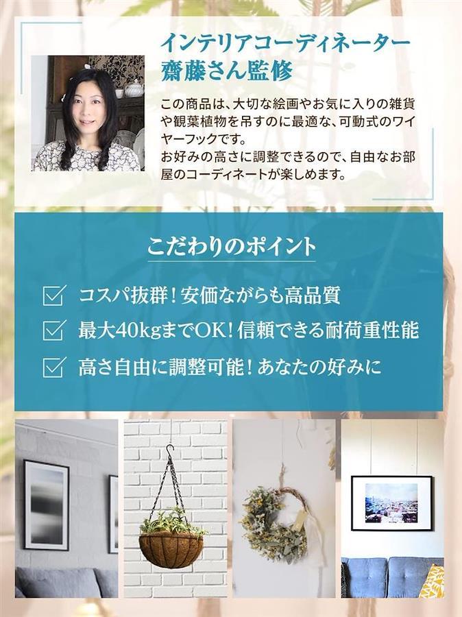 「製品性能」長さ0.5m~1.5mのステンレス製ワイヤーは、優れた防錆性と耐久性を備えており、使用荷重は約40kgです。