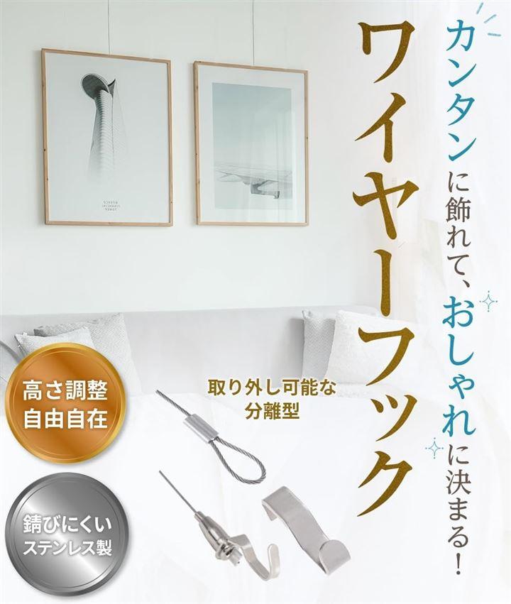 ワイヤーフックを用いれば、フックの位置を自由に上下に移動させることができ、作品の大きさや展示場所に応じて適切な高さに調節できます。