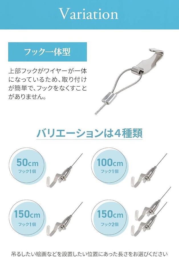 「製品概要」 絵画やハンドメイド作品の展示に欠かせないフック付きのワイヤーです。
