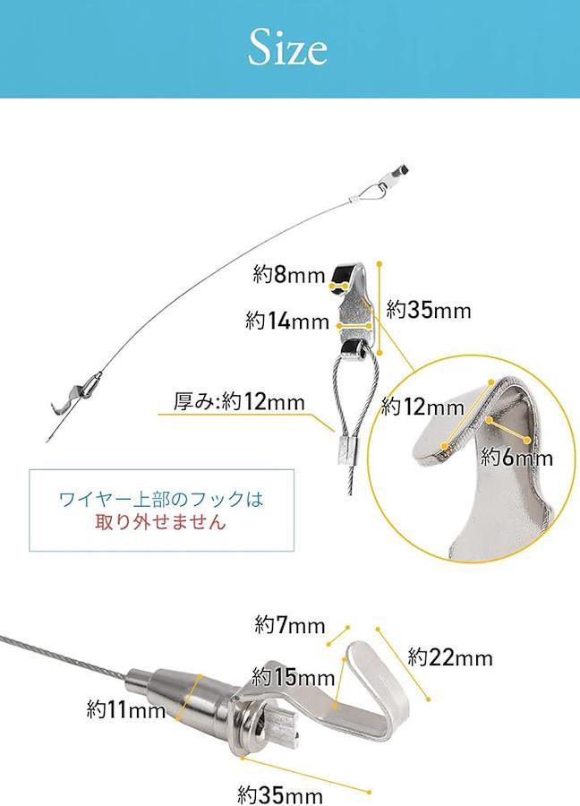 「使用方法」使用方法は非常にシンプルで、ワイヤーの上部レールフックなどにを引っかけ、ピクチャーフックを額縁の裏に引っ掛けるだけです。