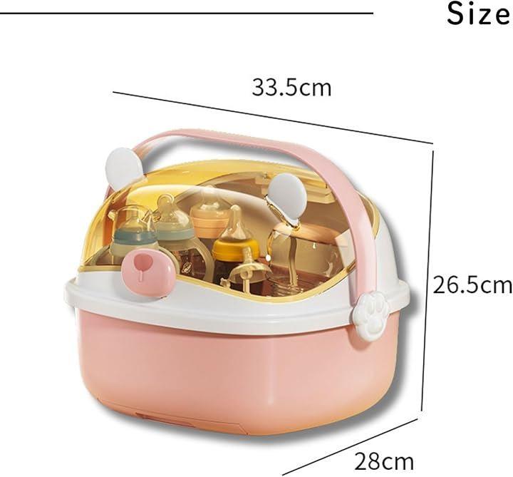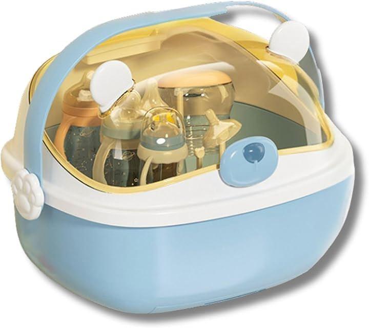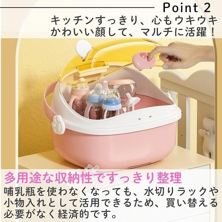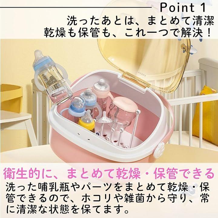 「衛生的に、まとめて乾燥・保管できる」透明カバーでほこりや虫の侵入を防ぎつつ、乾燥スタンド付きで哺乳瓶やコップなどをそのまま並べて清潔に乾燥・保管できます。