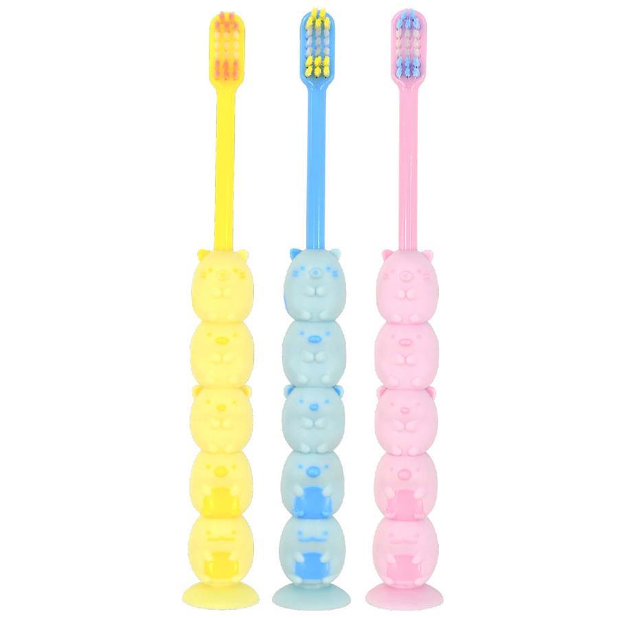 すみっコぐらしの歯ブラシで歯磨きも楽しくなります!くっついて倒れない!洗面台の場所をとりません。●吸盤でピタッとくっつき自立する。●磨き終わったらそのまま立たせておくだけ。●奥歯まで届きやすいコンパクトヘッド。●滑りにくく手にやさしいラバー加工。●毎日の健康は美しい歯づくりから!●3色1本ずつのセットとなっております。