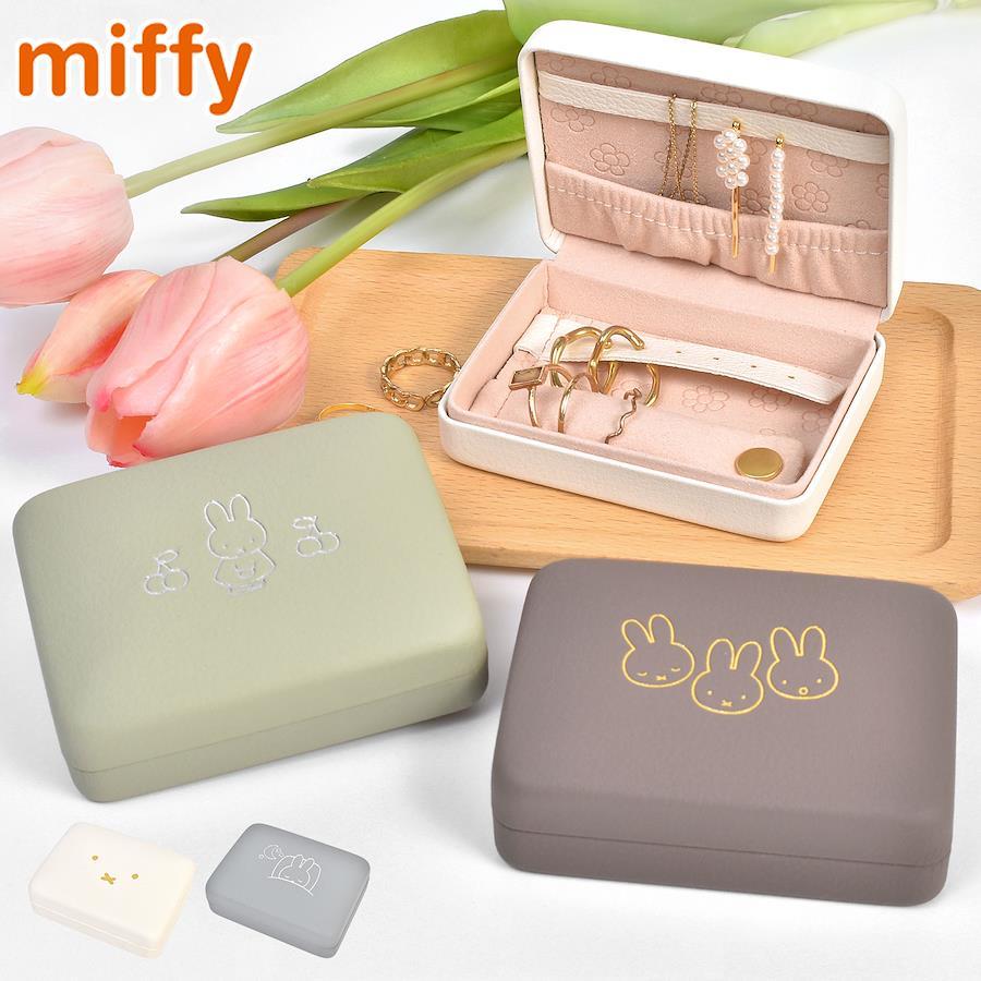 【ジュエリーケース】ミッフィーのさりげない箔押しデザインが上品でかわいい、手のひらサイズのジュエリーケース。ケースの中はアクセサリーを傷つけないマイクロファイバー生地。ネックレス、ピアス、リングなどをそれぞれ収納できるホルダーやポケットが備えられており、大切なアクセサリーを綺麗に持ち運べます。ちょっとした外出や旅行はもちろん、仕事中や運動中の一時置きにも。プレゼントにもぴったりのアイテムです。