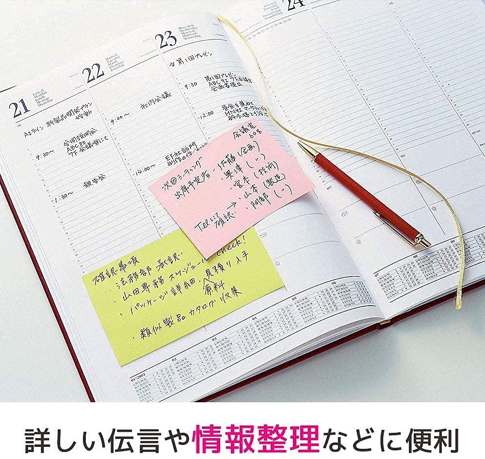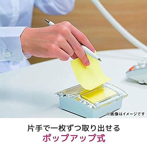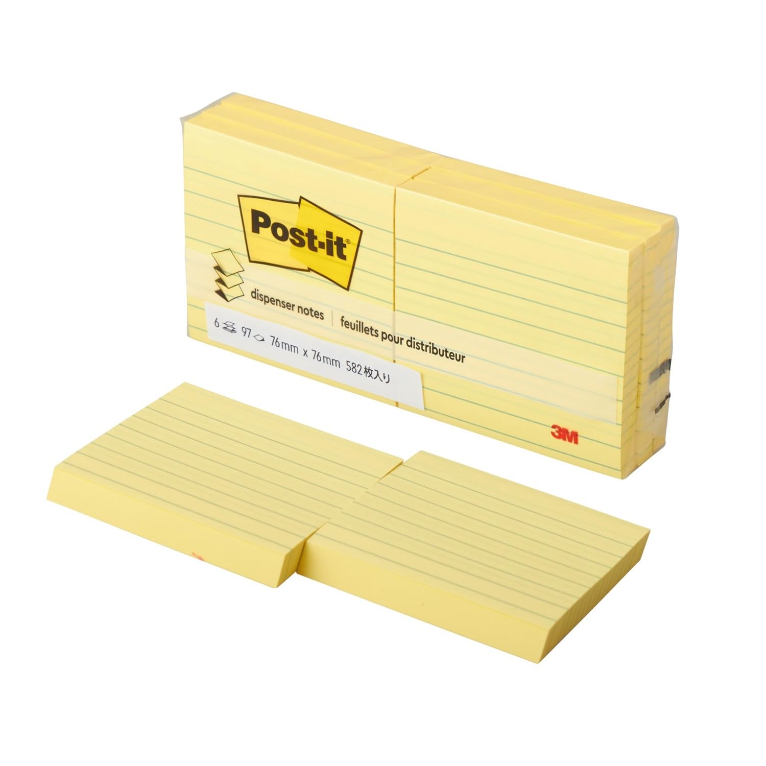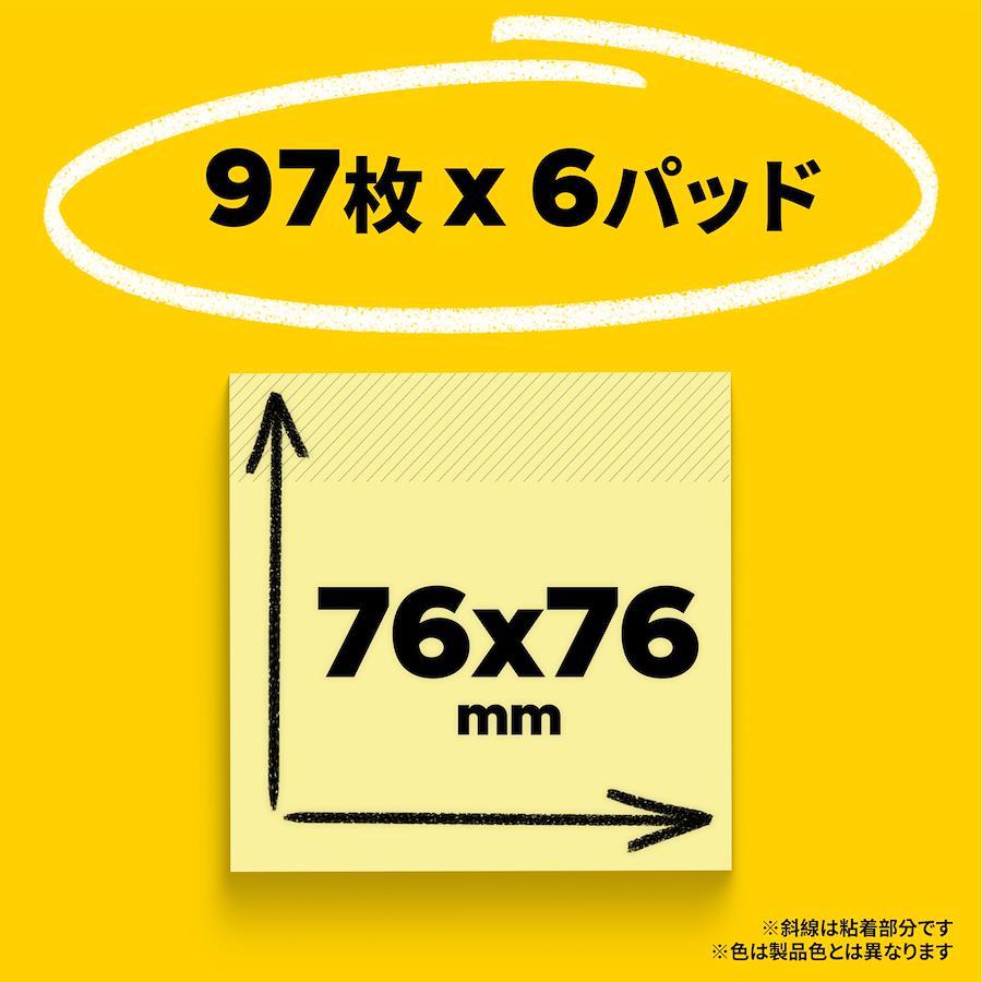 ・ふせんサイズ:76×76mm。 正方形の定番サイズのポストイット付箋。 詳しい伝言、情報整理などに便利なサイズ。・専用のケース(ディスペンサー)に入れて使うポップアップタイプ。・くり返し貼ったりはがしたりでき、相手をいためません。・ティッシュペーパーのように片手でふせんを上にさっと取り出せるので、忙しい時や電話しながらでもメモをとりやすい製品。いつも決まった場所に置いておけるから、使いたいときにすぐに使えて、デスクも片付く。 ケース入りなのでふせんが汚れにくく、最後の1枚までキレイに使いきれるのでムダがないのも魅力。・8mm間隔で罫線(ライン)をプリントしています。長文のメモや伝言などがきれいに書けて便利。・97枚×6パッド。・色:イエロー
