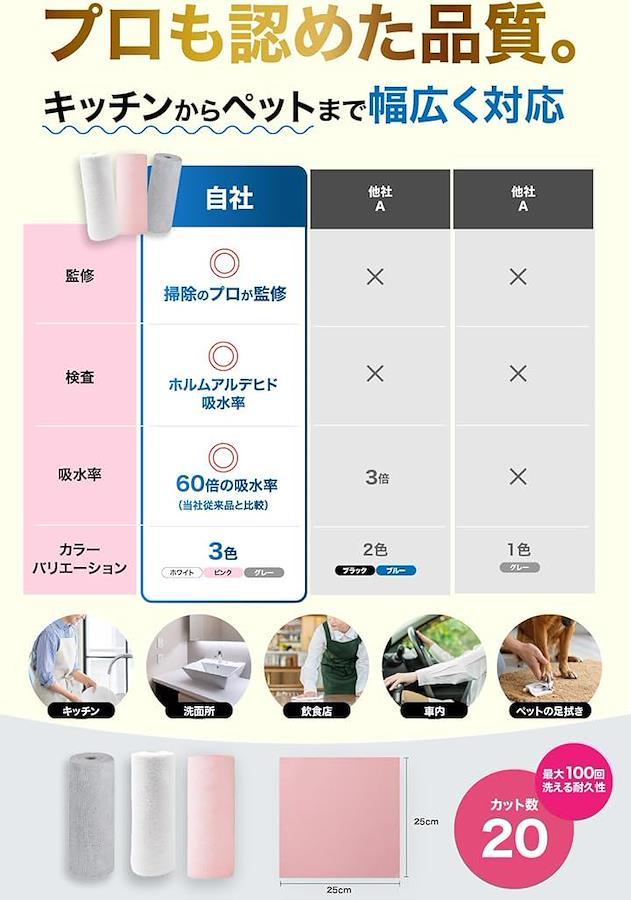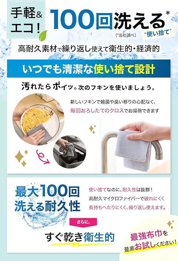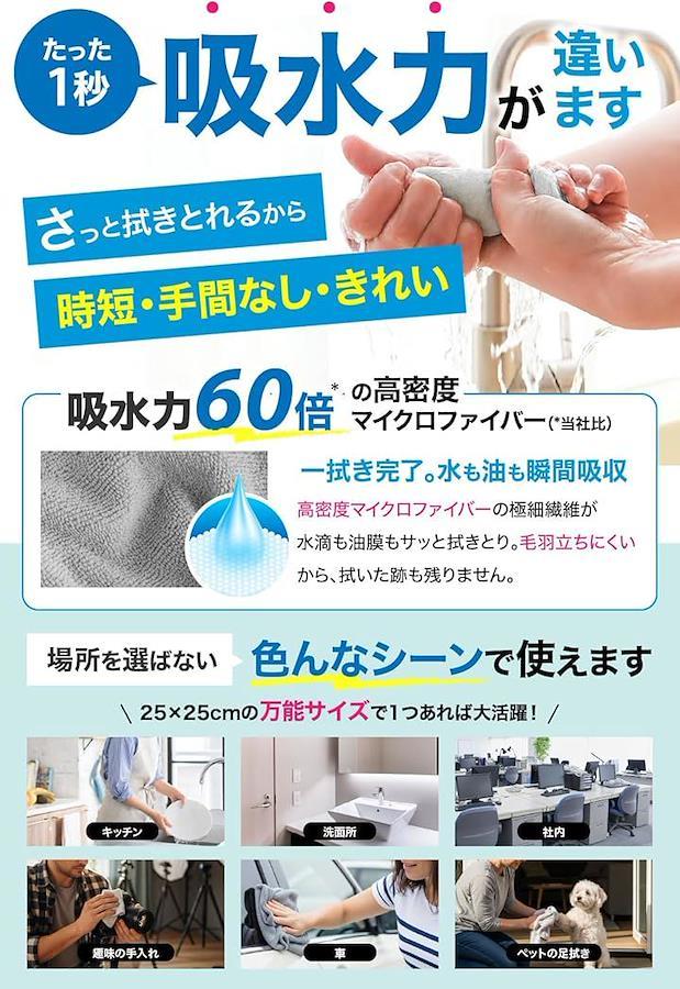 「吸水力で、拭き取りが一瞬。」 従来品より吸水率60倍アップ。高密度マイクロファイバーが、水分・油分・汚れをしっかりキャッチします。