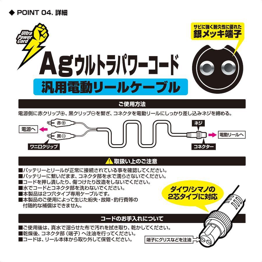 幅広い2芯タイプの汎用的に使える電動リールに対応するパワーコードが新登場です。汎用性の高い2芯タイプとガッチリ端子に接続できるワニ口クリップでがっちり掴みます。銀メッキ端子を採用した高耐久仕様で安心してご利用いただけます。軽量な2.2mと動きやすい2.5mの2レングスをラインナップ。