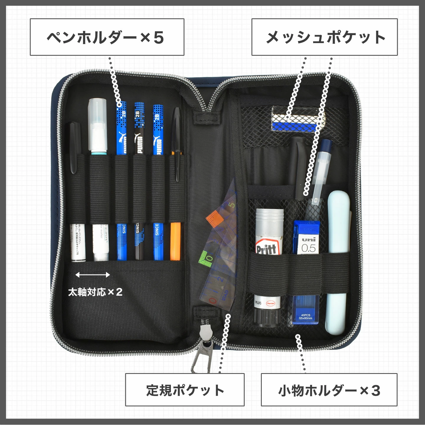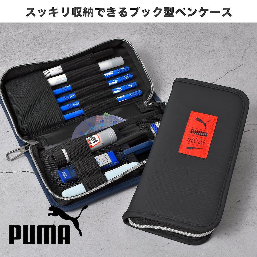【ブックタイプペンケース】人気スポーツブランド『PUMA(プーマ)』の機能的なポケット付きのブック型ペンケース。ホルダーやポケットを多数備え、散らかりやすい文房具をすっきりと持ち運べます。小学校高学年から中高生まで長く使えるアイテムです。