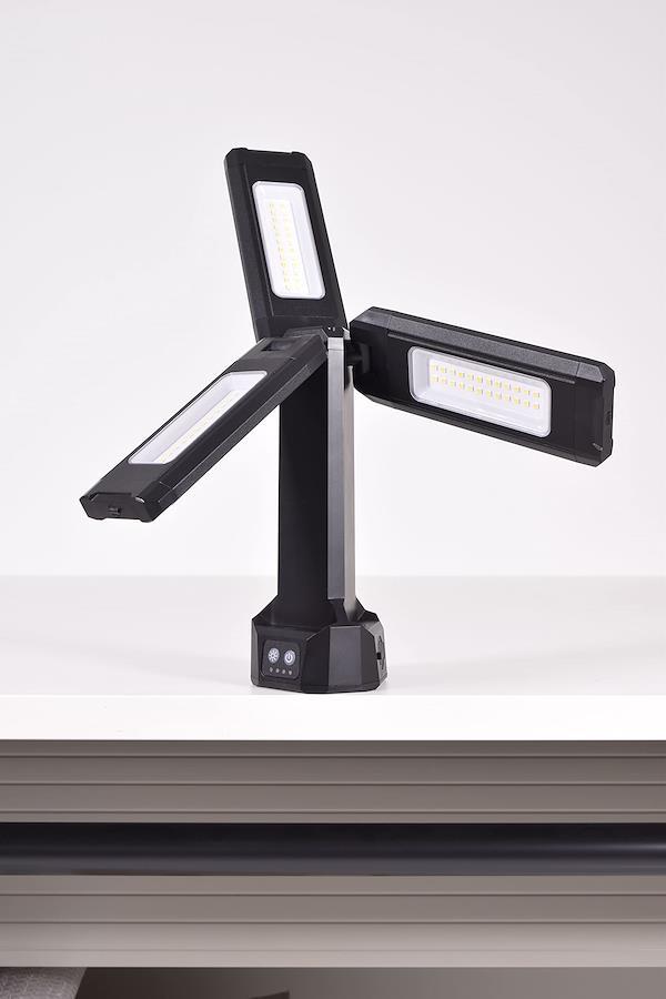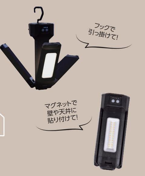 ●3つに分かれた灯具の角度をそれぞれ変えられます。●サイズ:幅376×奥行376×高さ358mm●重量:600g●全光束:HIGH/2000、MID/1200、LOW/700●ランプ種類:LED●調光機能:HIGH・MID・LOW・白色・昼光色●防塵・防水性能:屋内・屋外兼用型(IPX4)●連続使用時間:HIGH/2時間、MID/4時間、LOW/8.5時間●充電時間:3.5時間(2A)4時間(1A)●首振り角度:上下/0~180度(30度刻み)、左右/270度(右90度/左180度)●色温度:4000K/6500K●使用環境温度:-20~40℃フック・マグネットで使い方自由自在。電源を気にせず、いつでも何処でも使える充電式アクティブライト3つに分かれた灯具の角度をそれぞれ変えられます。サイズ:幅376×奥行376×高さ358mm重量:600g重量:600g